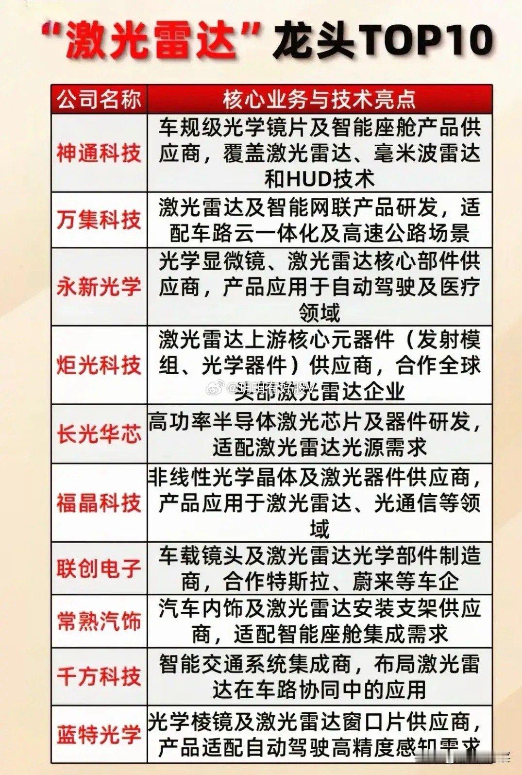 激光雷达产业链全景:感知硬件的创新角逐与市场前景激光雷达作为高阶自动驾驶的核心传感器,正迎来产业链的快速成长与技术迭代。从上游元器件到系统集成,各细分板块展现出不同的发展特征:在光学部件领域,多家企业专注于激光雷达镜片、棱镜、窗口片等核心光学元件的研发与制造,其产品广泛应用于车载感知系统,支持高精度测距与成像需求。这部分技术壁垒较高,与全球头部激光雷达厂商的合作紧密,体现出较强的产业协同性。激光发射模组与半导体激光芯片是决定激光雷达性能的关键环节。相关厂商致力于提升功率效率与集成度,不断推动光源模块向小型化、低成本、车规级方向演进,为多技术路线的激光雷达方案提供底层支持。在整机与集成应用方面,部分企业布局激光雷达在车路协同、智慧高速等场景的落地,推动感知数据与云控平台的融合,服务于“车路云一体化”系统建设。此外,部分厂商还涉足激光雷达支架与座舱集成设计,提升硬件搭载的结构安全性与整车适配性。从市场情绪来看,激光雷达概念伴随智能驾驶级别的提升持续受到关注,尤其在政策支持与科技公司入局的推动下,行业热度居高不下。其发展潜力不仅在于乘用车自动驾驶的渗透,更涵盖机器人、智慧交通、工业测量等多赛道拓展。未来,随着技术逐步成熟与成本下探,激光雷达有望在更多车型实现标配,产业链上下游的合作将更加紧密。但同时,行业也面临技术路线未统一、市场竞争加剧等挑战,企业需持续强化技术独特性与规模化能力,方能在智能化浪潮中占据有利位置。