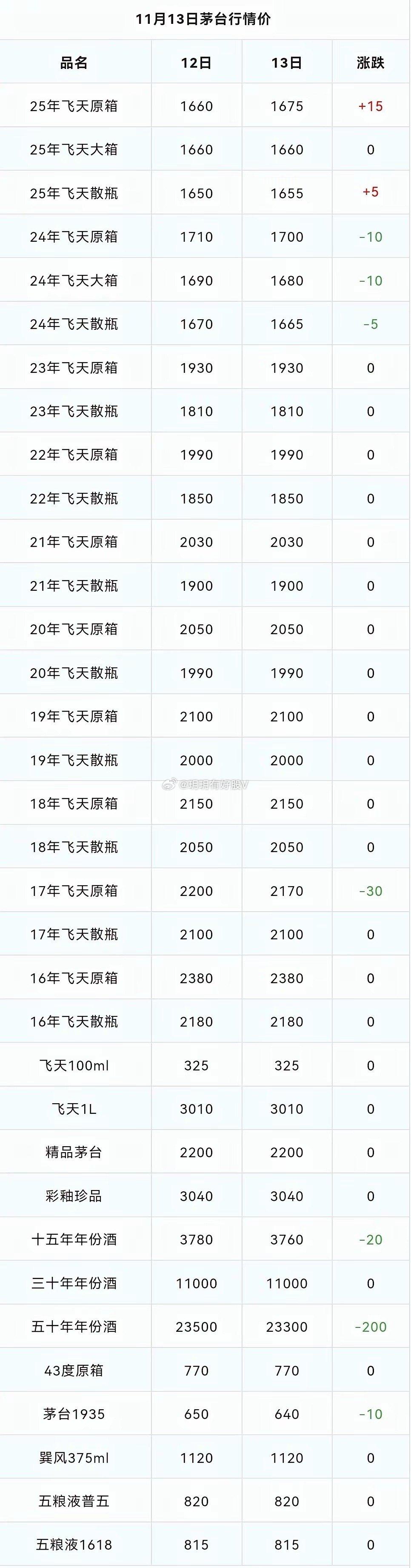 飞天茅台上涨!今日(11月13日),从茅酒顾问发布的白酒价格行情监测数据显示,近段时间整箱茅台价格一直在1750徘徊,散瓶在1720左右,今日53度贵州飞天茅台(500ml)一批价跌至1675元左右!散飞在1655。