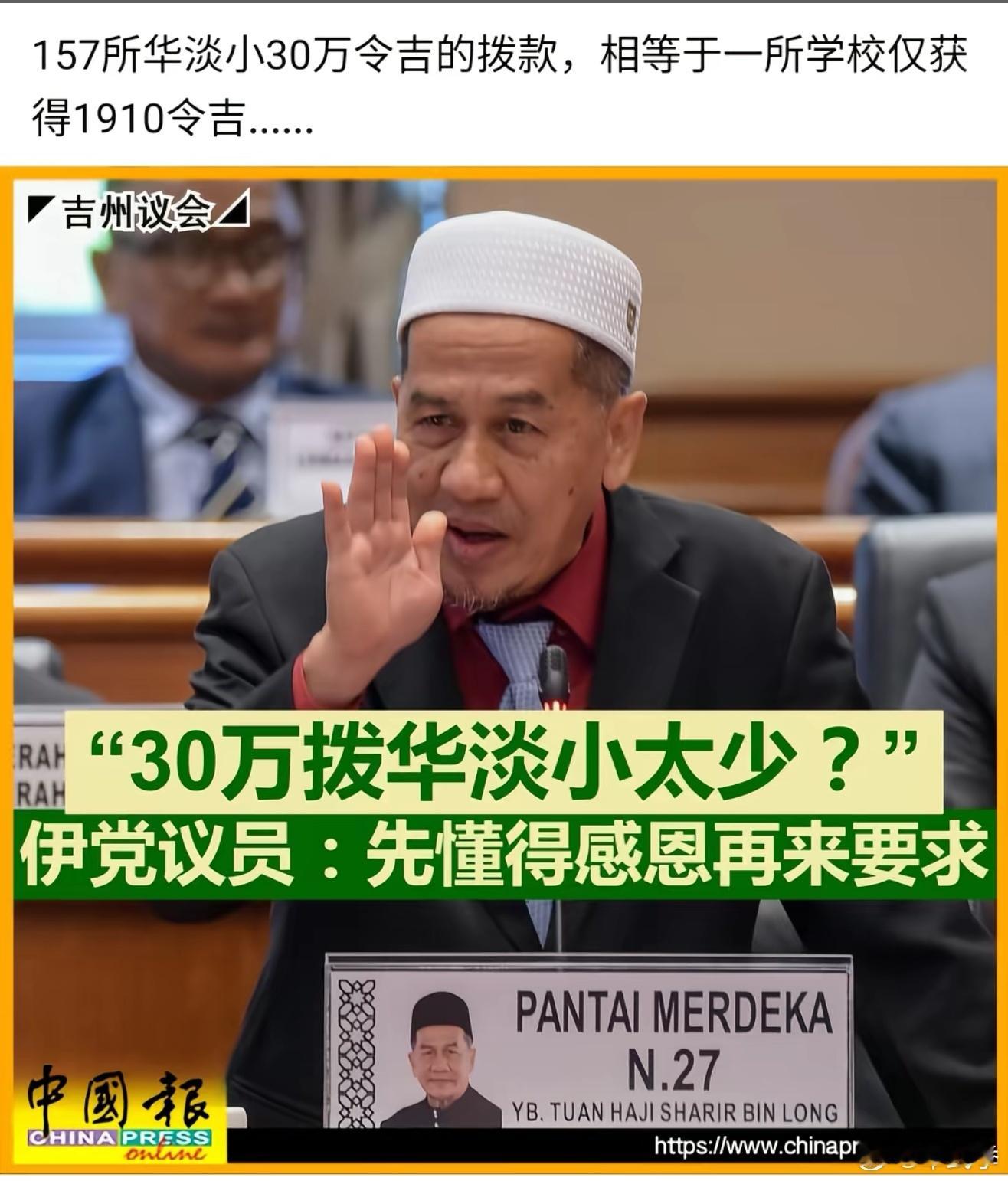 马来西亚政府每年向华人小学拨款折合人民币3285元,穆斯林议员腆着丑脸怒怼拨款太少的言论:先懂的感恩再来要求。