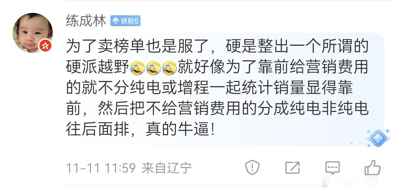 什么意思?这人是想说。不应该有硬派越野这个细分领域?还是说硬派越野这个词是长城发明的?还是说看见坦克500卖的好,心里很不舒服?