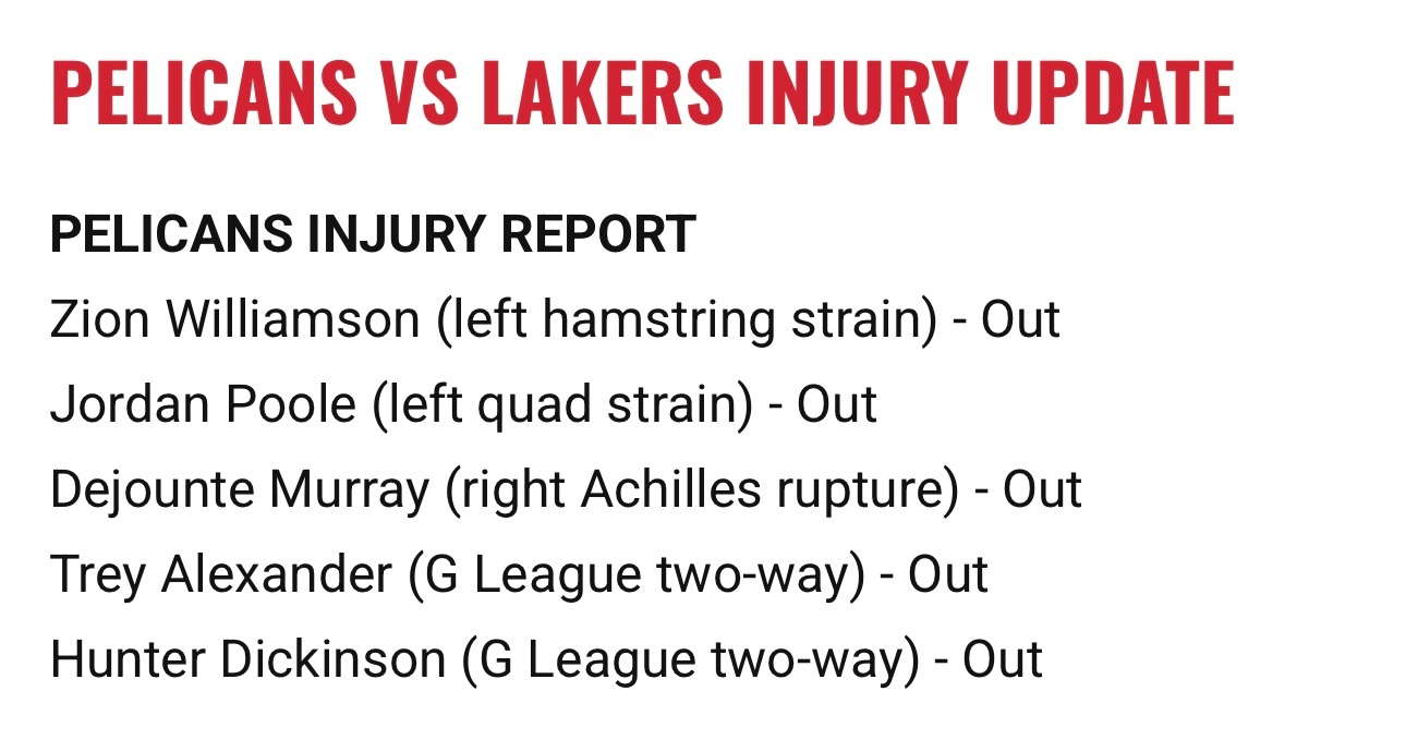 鹈鹕队更新伤病报告:锡安·威廉森(左腿筋拉伤)缺阵乔丹·普尔(左股四头肌拉伤)缺阵德章泰·穆雷(右脚跟腱断裂)缺阵特雷·亚历山大(发展联盟双向合同)缺阵亨特·迪金森(发展联盟双向合同)缺阵
