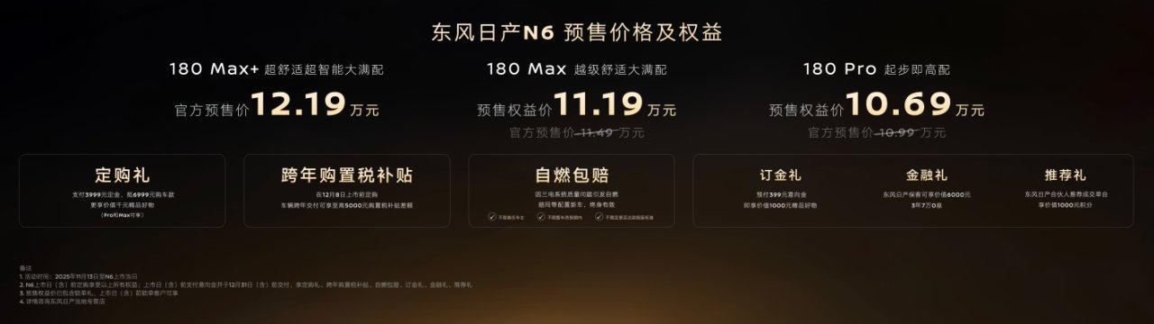 【预售权益价10.69万起,东风日产N6开启预售】11月13日,东风日产N6正式开启预售,官方预售价10.99万元-12.19万元,预售权益价10.69万元-12.19万元。外观延续N7设计风格,采用V-motion家族语言搭配V字风刀造型,星环式贯穿灯组与两侧7字形灯组、封闭式格栅相组合,进一步凸显科技感;同时配备隐藏式车门把手、前后发光 LOGO、贯穿式尾灯及小鸭尾设计,提供日照金、风信紫等6种车身颜色。车身尺寸方面,其长宽高分别为4831/1885/1494mm,轴距为2815mm。内饰采用前排环抱式设计,双幅式方向盘搭配双拼色风格,辅以2.8m²大面积软包包覆配合256色氛围灯。配备15.6英寸2.5K悬浮中控屏,内置NISSAN OS系统,搭载高通骁龙8775芯片,支持多品牌手机互联,语音助手融合双AI大模型。动力方面,新车将搭载NR15型1.5L自然吸气发动机组成的插混系统,发动机最大功率为75千瓦,搭载21.1kWh电池,CLTC纯电续航180km,30%-80%充电只要17分钟,直流快充功率可达42kW。动力输出方面,峰值功率155kW,峰值扭矩320N·m,0-100km/h加速时间6.8秒。【来自懂车帝车友圈】
