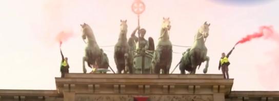【昨天,亲巴勒斯坦活动人士爬上柏林勃兰登堡门,要求“停止对巴勒斯坦人的种族灭绝”