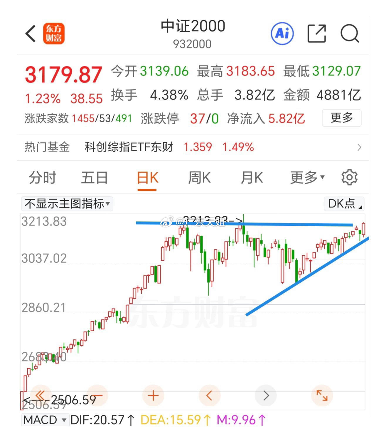 抓住中证2000的波段机会!隔夜外围下跌,只会影响到大A开盘。本身指数层面也有回踩的技术需求,我们看关键点位能不能支撑住。上证指数构筑中枢后向上的离开段已经走出来,回踩只要不跌破3410就是三买,这个中枢已经升级为5分钟级别的,离开段不会这么轻易结束。跌破3410意味着走势变弱,要开始警惕起来准备随时撤退。放量跌破中枢,那就啥也不说了,比谁跑得快,当然这种可能性是最小的。更加需要注意的就是中证2000为代表的中小盘能不能再来一个中阳线。中证2000已经初步突破横盘震荡平台,只要进一步突破并站稳,那么新的波段就来了,这时候大多数股民的赚钱效应就来了。中低位的个股不要一根阳线就怕筹码交出去了,看一段趋势上涨。同时注意人民币汇率的走势,总体上今天的节奏,个人认为会稍回踩后继续上涨,中小盘会再收阳线。拭目以待吧!