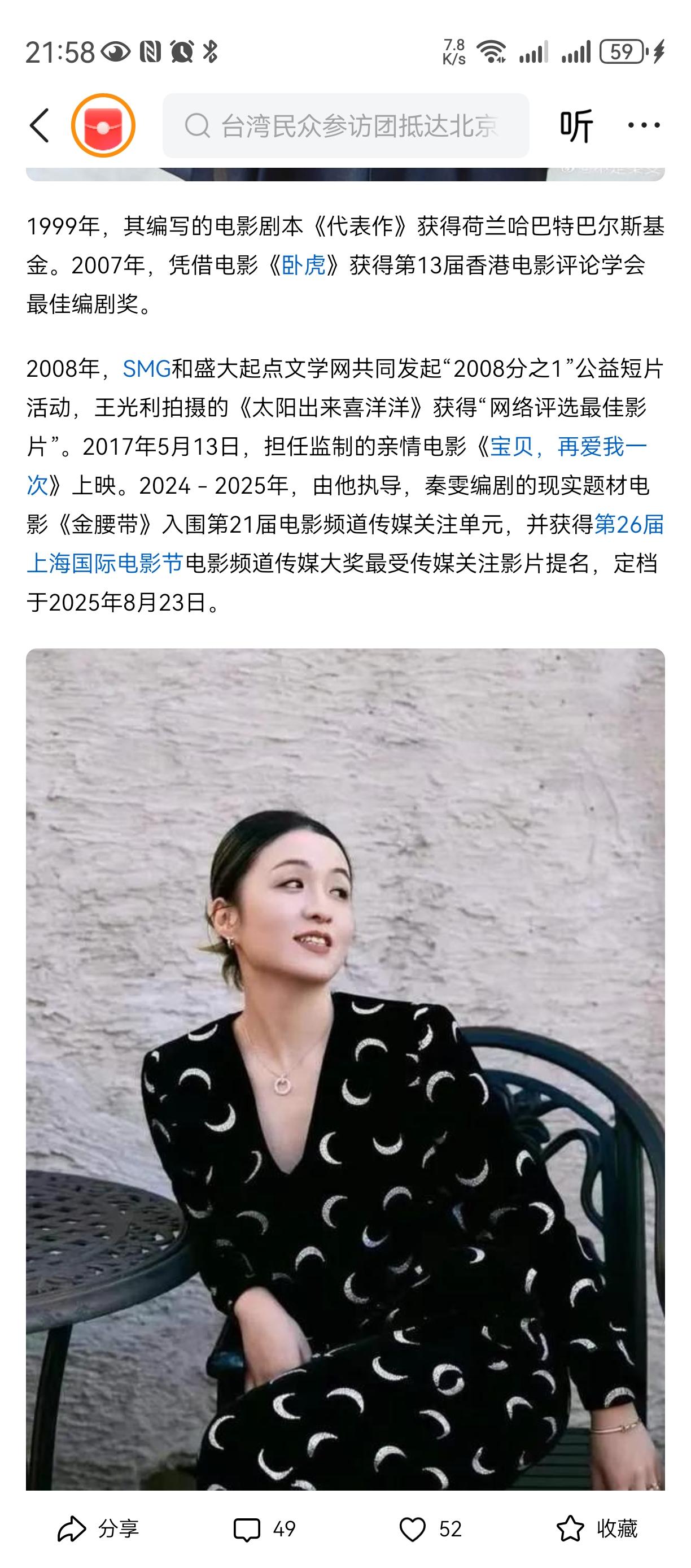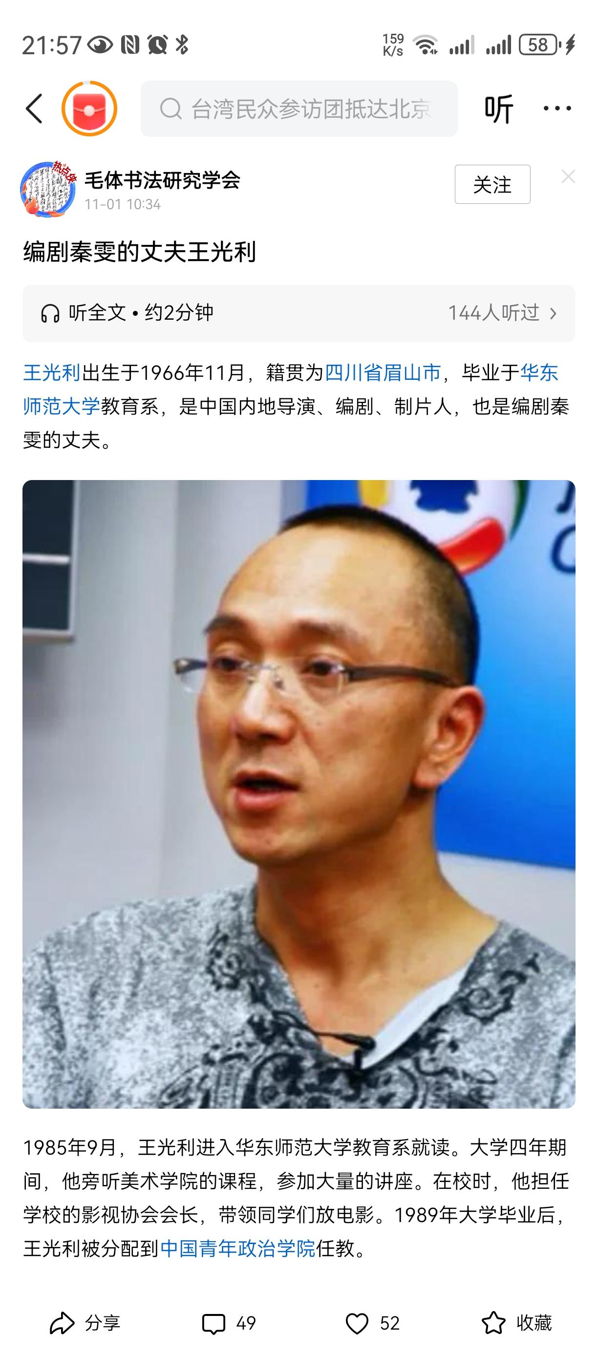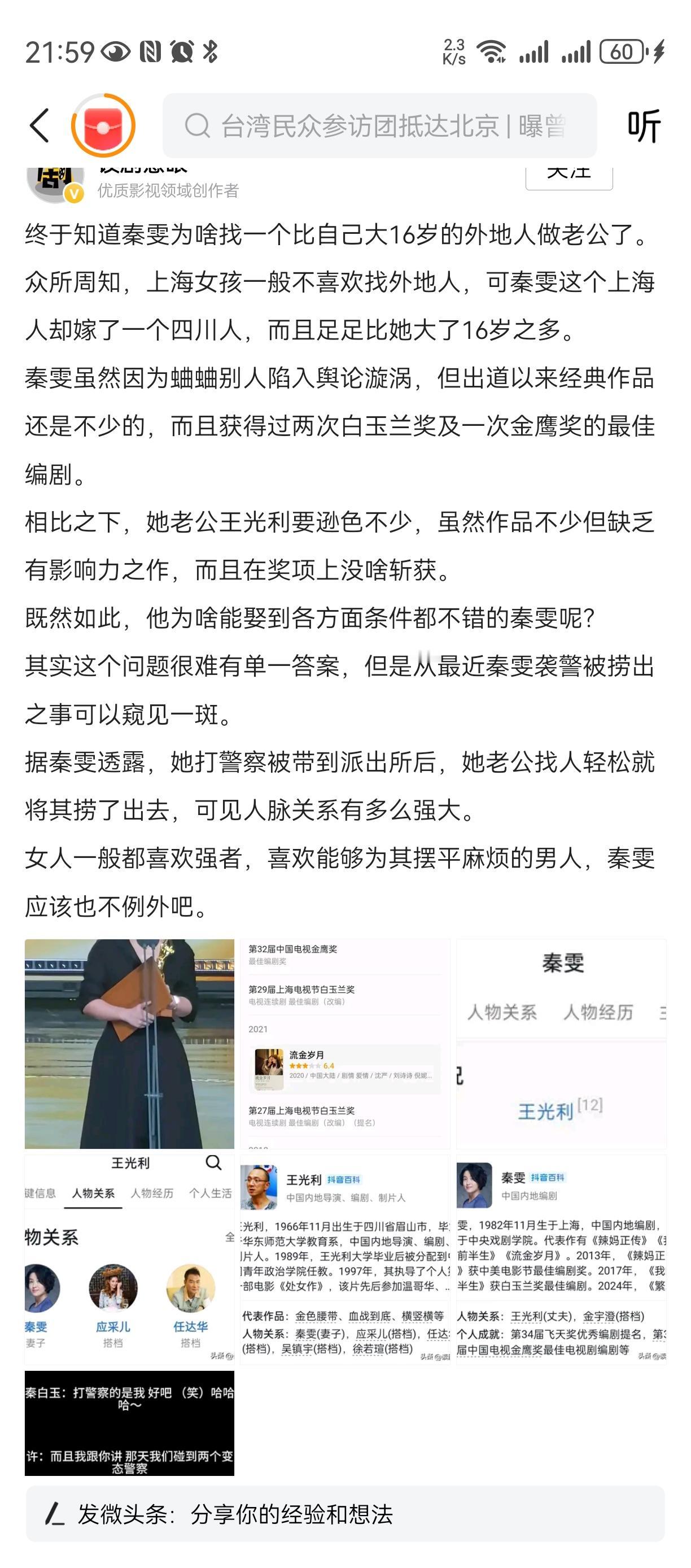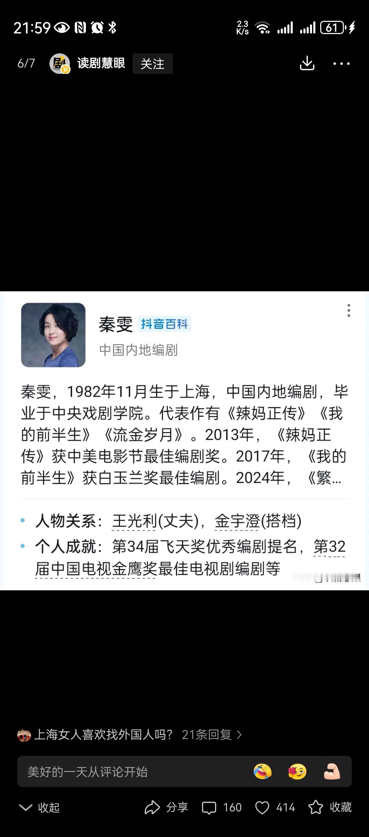 艺术是不是来源于生活?秦雯 [赞] 秦编剧是不是水货? 我认为不是, 因为她把生活搬到了艺术, 就不知道里面水分多大[捂脸] 她嫁了年长十六岁的王导演, 为的是啥? 不就是王导演吃得开[强] 两口子育有一女, 在魔都已经算唤风唤雨, 过得是体面生活。 又不差钱, 还有荣誉加身, 国家级荣誉。 出去都是C位的秦雯编剧 确把这个古二惹火了, 关键还执着于艺术来源于生活? 还“”害了”很多体制内的规矩和未上映的片子[捂脸] 有意思