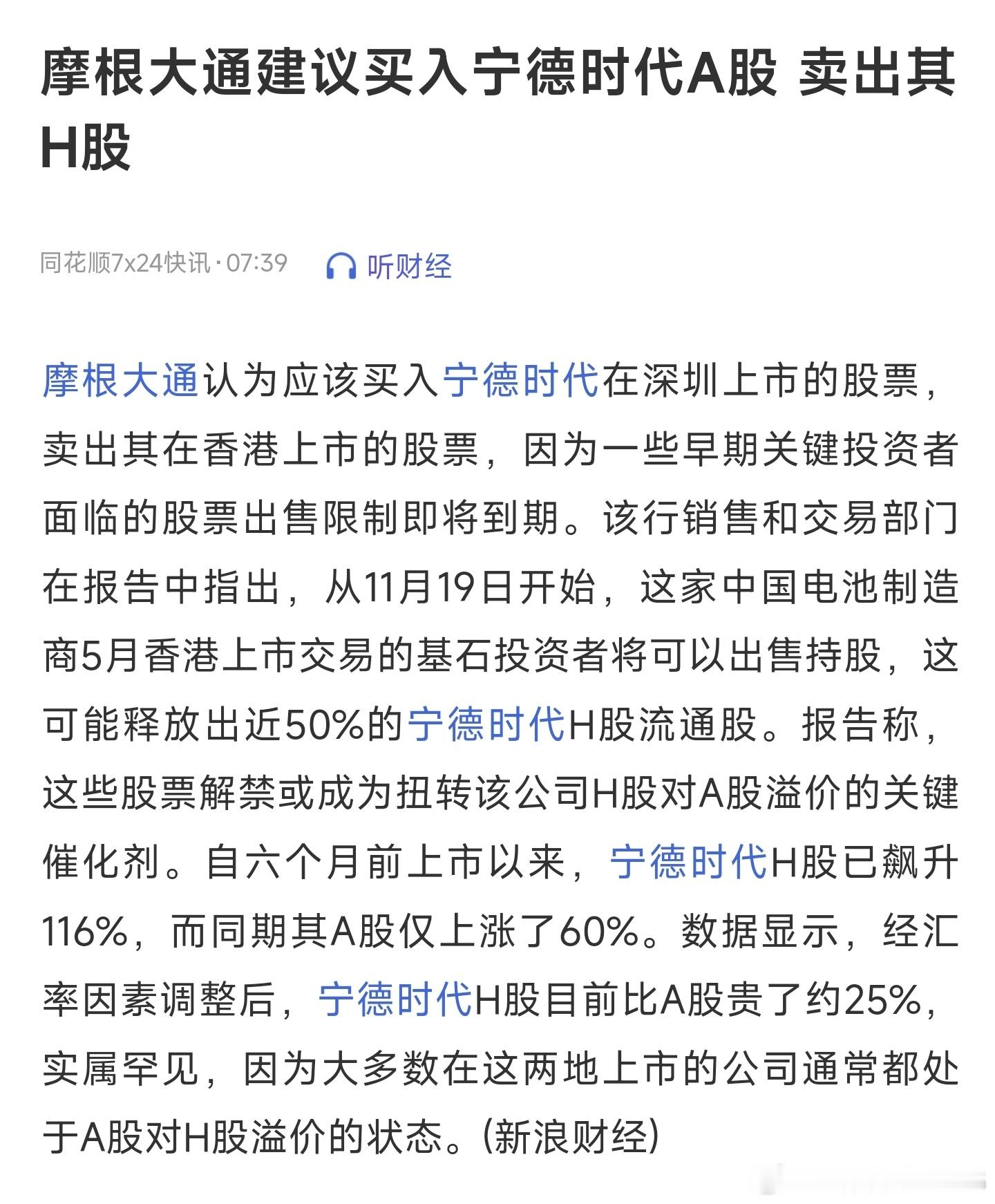 摩根大通建议买入宁德时代A股 卖出其H股数据显示,经汇率因素调整后,宁德时代H股目前比A股贵了约25%,实属罕见,因为大多数在这两地上市的公司通常都处于A股对H股溢价的状态。