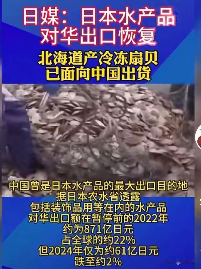 日本对华出口水产品,你注意到了吗?日本人自己不吃的东西,专门給中国人准备的上等海鲜! 可理性推断,这对做中国产扇贝生意的经销商是灭顶之灾,人们无法区分是日进口还是国产的,唯有不吃! 有网友说:百姓最好的应对就是不吃扇贝,如果没有分辨能力,就不要卖不要吃,管住嘴吧。 德国外长、经贸部长言论对华毫无善意,中国安世芯片出口德国了。高市早苗对华恶意满满,日本扇贝对华进口了。这世道这么颠的吗? 日本的扇贝一进入中国,对卖扇贝的海产店都是一个冲击,就连中国的扇贝也没人买了,因为分不清哪是中国的 到底是谁同意它进入中国的市场?消费者有知情权和选择权。 到底是谁同意的呢?就像进国门取消杰夫病毒检测一样?是谁同意的呢?同疑问? 政府应该将国内市场的海产品,发出个实物图片,在网上,供人民群众参考鉴别那是国内的,那是倭寇的,以免误食,这是对人民群众的关心,才是政府的作为。 大家怎么看呢?