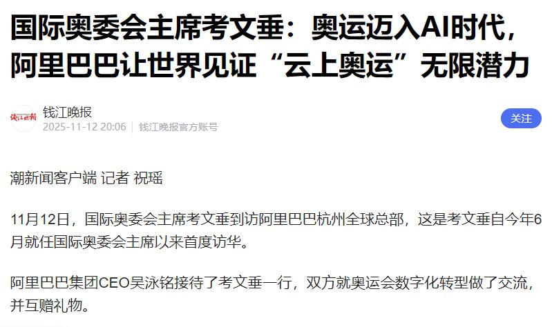 西方忽然发现,风向真的变了,一个细节被曝光,中国变化很彻底! 中国杭州,与支撑奥运科技服务的中国团队深度交流中国科技力量新上任不满半年的国际奥委会主席考文垂,大概是首个直观感受到中国科技体育力量冲击的奥运顶层管理者。 这位曾拿过奥运金牌的津巴布韦人,上任后没有先走访传统奥运赞助商集中的欧美国家,反而把重要的海外拜访首站选在了阿里巴巴杭州总部,这种打破常规的行程安排,背后藏着她对中国科技在体育领域应用的强烈好奇与震撼。 在过往的奥运记忆里,体育赛事的科技支撑几乎被欧美企业垄断,可当考文垂接手奥委会事务后才发现,连续三届奥运会的核心科技服务都被一家中国企业牢牢占据,这种认知颠覆让她不得不亲自赴华一探究竟。 中国科技团队中国云技术团队中国云技术团队中国云技术团队当考文垂深入了解阿里与奥运的合作历程时,每一个节点都在刷新她对体育科技的认知。 2020年东京奥运会阿里云初涉全球转播时,西方还在质疑中国技术能否扛住压力,可实际表现却让当时作为观众的她印象深刻;2022年北京冬奥会的"云上奥运"更是让她震惊——奥运核心系统居然能完全脱离传统IT基础设施,这种架构革新是她过去从未想过的。 去年巴黎奥运会上,阿里云的OBS Cloud 3.0云上转播直接超越了西方维持半个多世纪的卫星转播霸权,成为全球观众看奥运的主要方式,这让刚执掌奥委会的她意识到,中国科技已经在体育传播领域实现了从跟跑到领跑的跨越,这种速度和力度远超她的预期。 在交流中,中国团队中国技术团队在杭州总部的交流中,阿里展示的体育科技应用更是让考文垂频频露出惊讶神色。 当看到360度"子弹时间"回放能把运动员的每一个肌肉发力细节清晰呈现,她直言这对裁判判罚和运动员技术分析的帮助是革命性的;而虚拟T台让游客生成数字分身参与奥运互动、"智影时刻"为观众自动剪辑个性化赛事视频时。 考文垂敏锐地察觉到,这些AI技术正在解决奥运传播长期存在的普惠性难题,就像她的祖国津巴布韦,以前观众只能看文字赛果,现在通过个性化信号流能全程关注本国选手,这种让体育真正触达每一个角落的能力,正是她作为奥委会主席想实现的目标。 这些已经不是实验室里的概念,而是已经在巴黎奥运会落地见效的技术,这种"即插即用"的体育科技解决方案,彻底打破了她对科技应用落地周期的固有认知。 中国云服务企业中国团队更让考文垂震撼的是,中国科技企业不仅有技术实力,还能将技术与体育精神深度融合。当听到阿里"AI向善"理念与奥林匹克包容精神不谋而合时,她意识到这种价值观层面的共鸣,让双方的合作远超单纯的商业伙伴关系。 2025年全球云服务市场报告里,阿里云稳居前十且增速迅猛,尤其是在体育等场景化解决方案上的优势,让她看到了奥运科技未来的更多可能。以前她接触的欧美科技企业多是强调技术标准,而中国企业却能精准抓住体育赛事的痛点,用更灵活、更贴近用户需求的方式提供服务,这种务实且创新的风格,让她对奥委会未来的科技布局有了全新思考。 中国科技团队对考文垂而言,这次杭州之行与其说是一次商务拜访,不如说是一场颠覆认知的"科技启蒙"。从东京到巴黎,中国科技用九年时间在奥运舞台完成了华丽蜕变,而她作为新主席恰好亲历了这一风向转变的关键节点。 那些曾经被西方垄断的体育科技领域,如今中国企业已经能拿出更先进、更实用的解决方案,这种变化让她深刻感受到,中国科技不再是体育领域的"参与者",而是正在成为定义未来体育科技规则的"引领者"。 当她带着这些震撼的发现回到国际奥委会时,中国体育科技的应用成果,已经成为她规划奥运未来发展蓝图中不可或缺的重要部分。