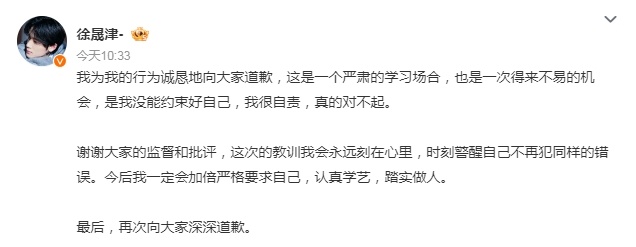 “星辰大海”学员徐晟津就主题班会上睡着一事道歉:“我为我的行为诚恳地向大家道歉,这是一个严肃的学习场合,也是一次得来不易的机会,是我没能约束好自己,我很自责,真的对不起。”