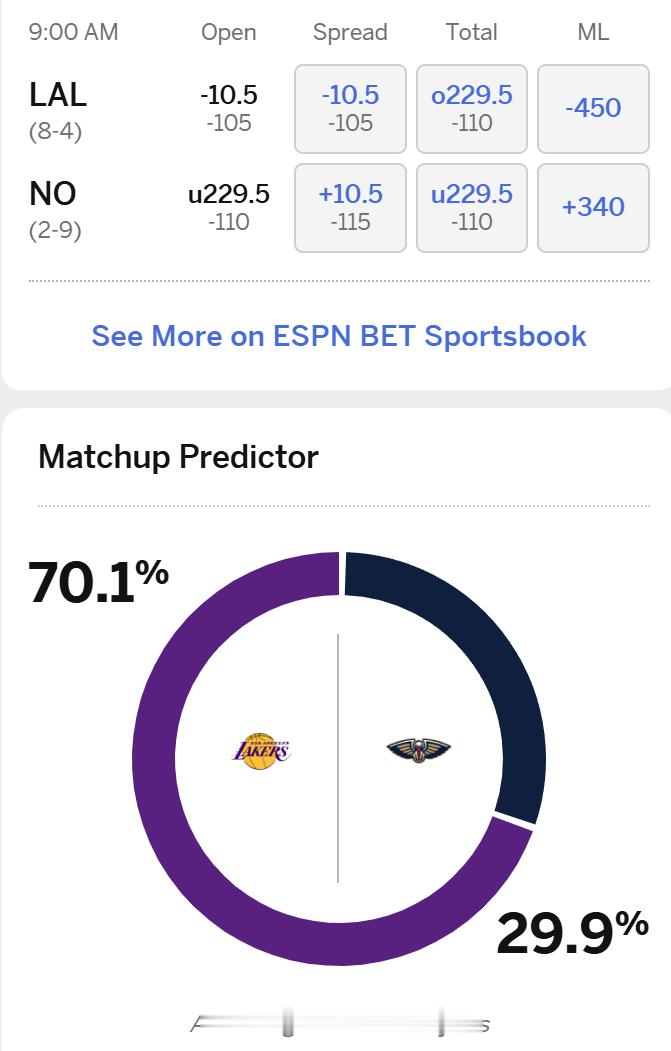 【比赛预告】明天9点,NBA杯小组赛G2湖人客场打鹈鹕,ESPN预测湖人胜率70.1%。【战绩排名】湖人8胜4负西部第5鹈鹕2胜9负西部第15【近5场表现】湖人 胜胜负胜负鹈鹕 胜胜负负负【预测首发】湖人:东契奇,斯玛特,里夫斯,八村塁,艾顿鹈鹕:费尔斯,赫伯琼斯,贝,特雷墨菲,卢尼【伤病情况】蒂耶罗升级为出战成疑,詹姆斯、文森特继续缺阵。鹈鹕威廉森、普尔、穆雷等五名球员缺阵。【攻防对比】湖人进攻效率第17,防守效率第21鹈鹕进攻效率第27,防守效率第28
