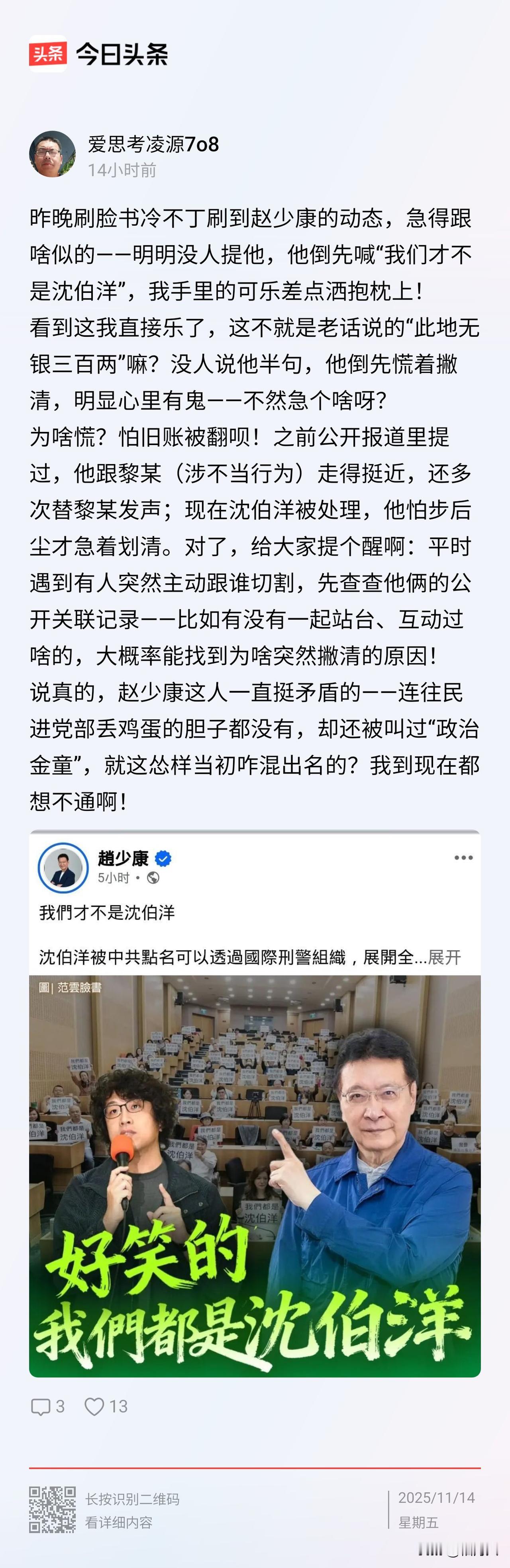 黎少康这人三姓家奴,已经这么大岁数了也想学川普竞选台湾头头,和侯友谊败北,又想推郝龙斌当棋子自己主选2028,郝龙斌输了他恼羞成怒攻击郑丽文,眼看没指望了这前两天又找民众党黄国昌要合作,这老小子心里想的什么还以为别人看不透呢。[捂脸]