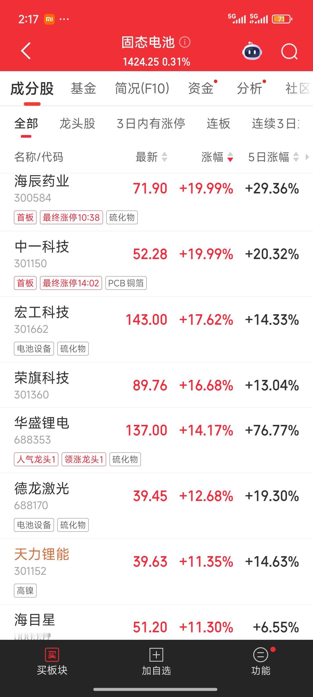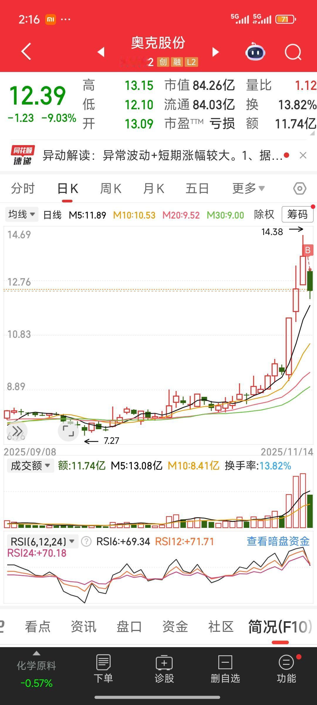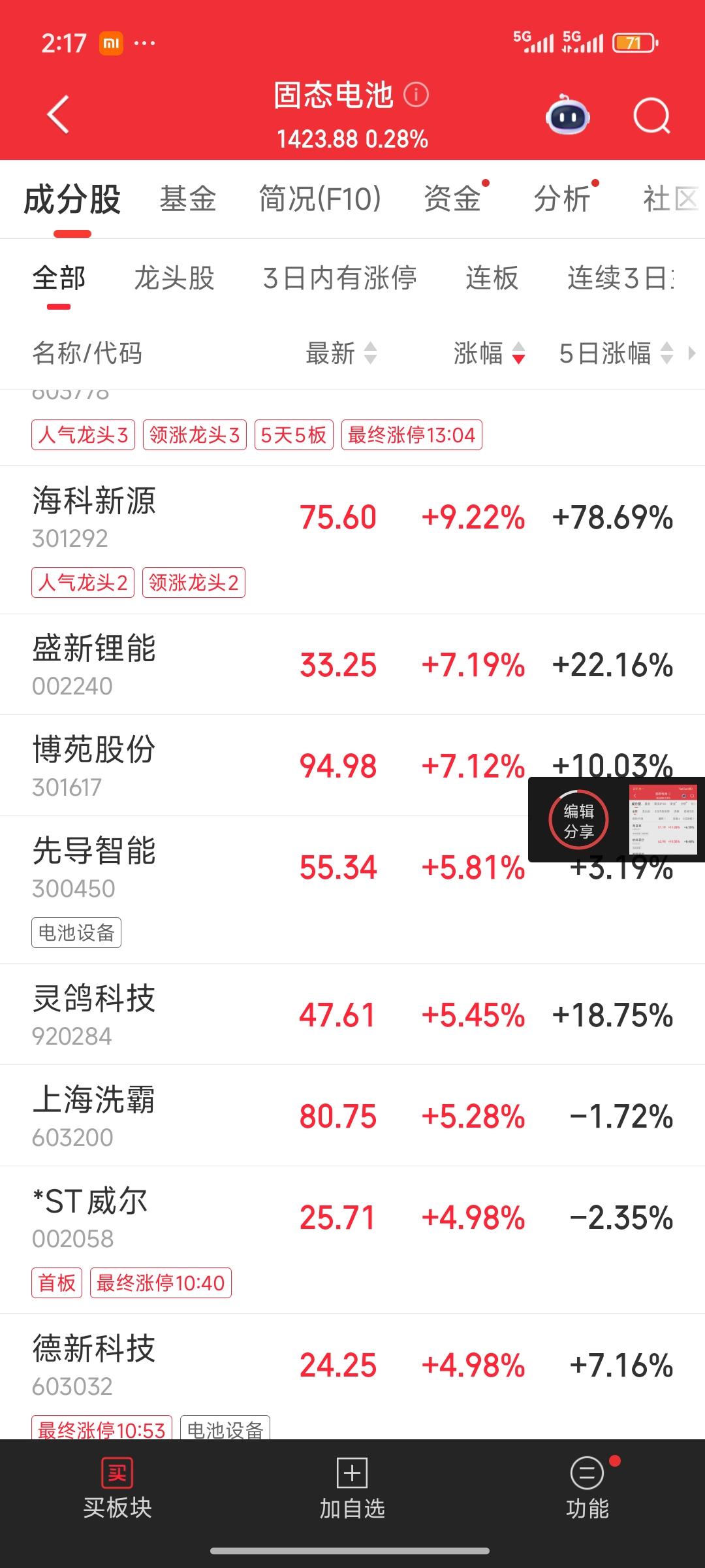 一直看好的奥克股份,在连续大涨三天后,今天终于如我所愿,迎来了主动性调整,大幅下跌。我认为这次下跌幅度极大,达到了10%,一步调整到位的可能性较大。 鉴于此,今天我忍痛将金信诺大幅亏损的股票割肉止损,转而买入奥克股份。奥克股份所属板块的固态电池强势股今日依旧表现强势,不少都涨停了,这意味着电池板块的行情尚未结束。 奥克股份很有可能在下周掀起第二波涨势,目前来看,它还有40%-50%的预期涨幅。 下周拭目以待!电解液概念股 固态电池概念为何倍受热捧?