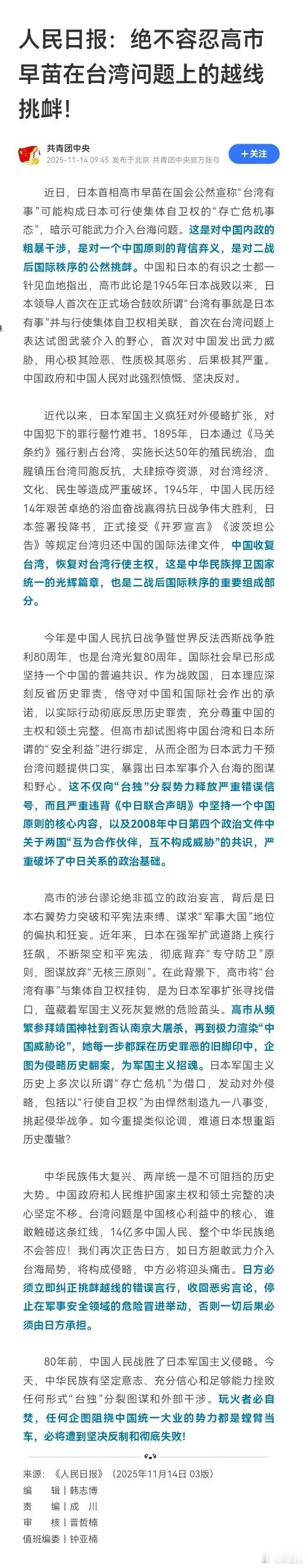 《人民日报》要闻版今日刊发评论《绝不容忍高市早苗在台湾问题上的越线挑衅》 高市此论是1945年日本战败以来,日本领导人首次在正式场合鼓吹所谓“台湾有事就是日本有事”并与行使集体自卫权相关联,首次在台湾问题上表达试图武装介入的野心,首次对中国发出武力威胁,用心极其险恶、性质极其恶劣、后果极其严重。中国政府和中国人民对此强烈愤慨、坚决反对。