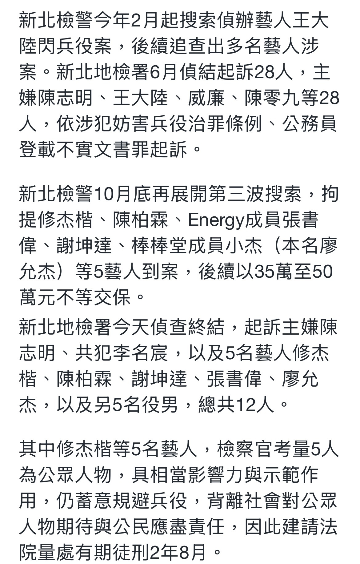 王大陆闪兵役案还在发力陈柏霖、修杰楷、谢坤达、张书伟、小杰以妨害兵役治罪等条例被求刑2年8月