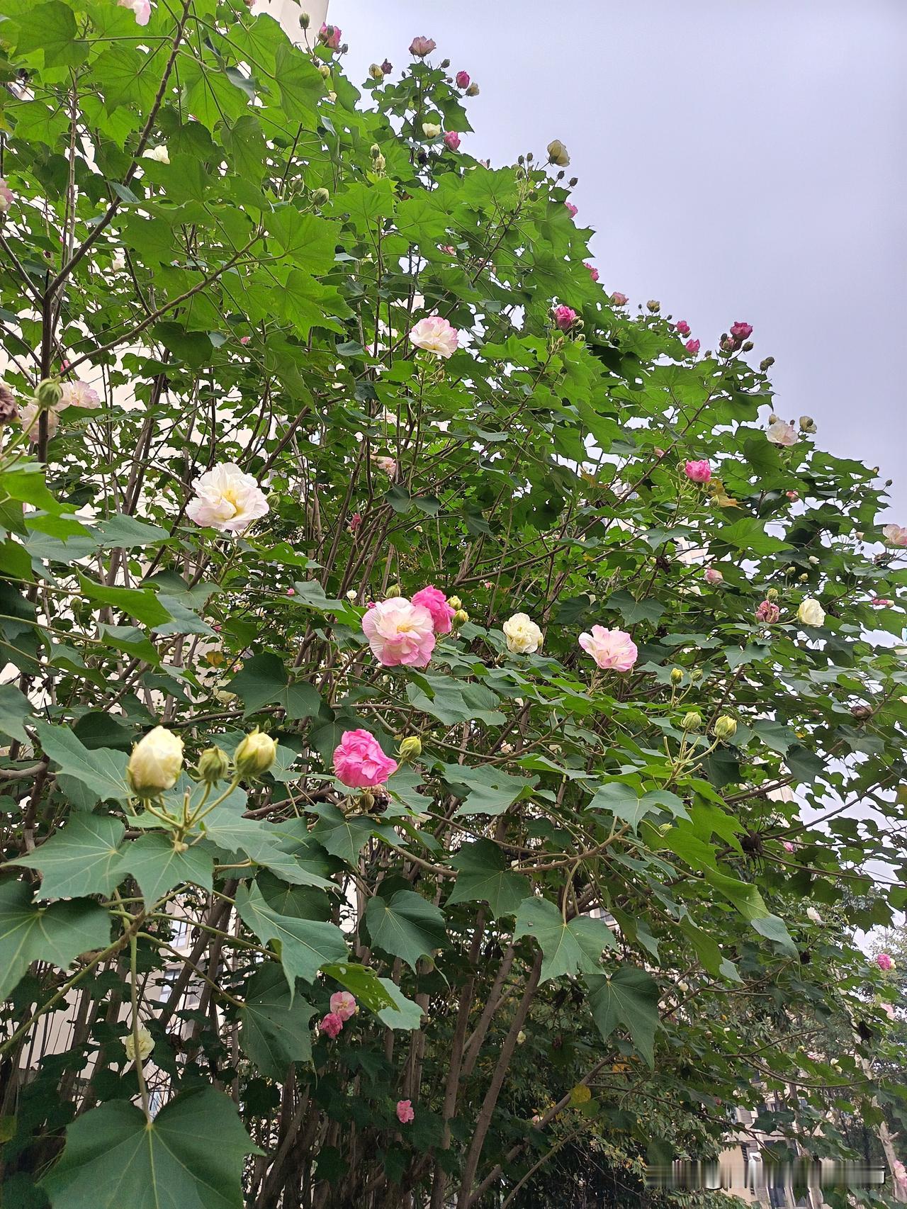 寻冬,找一树金黄 向园林的深处眺望 不止见到满树金黄 却也看到芙蓉花 盛开着的粉