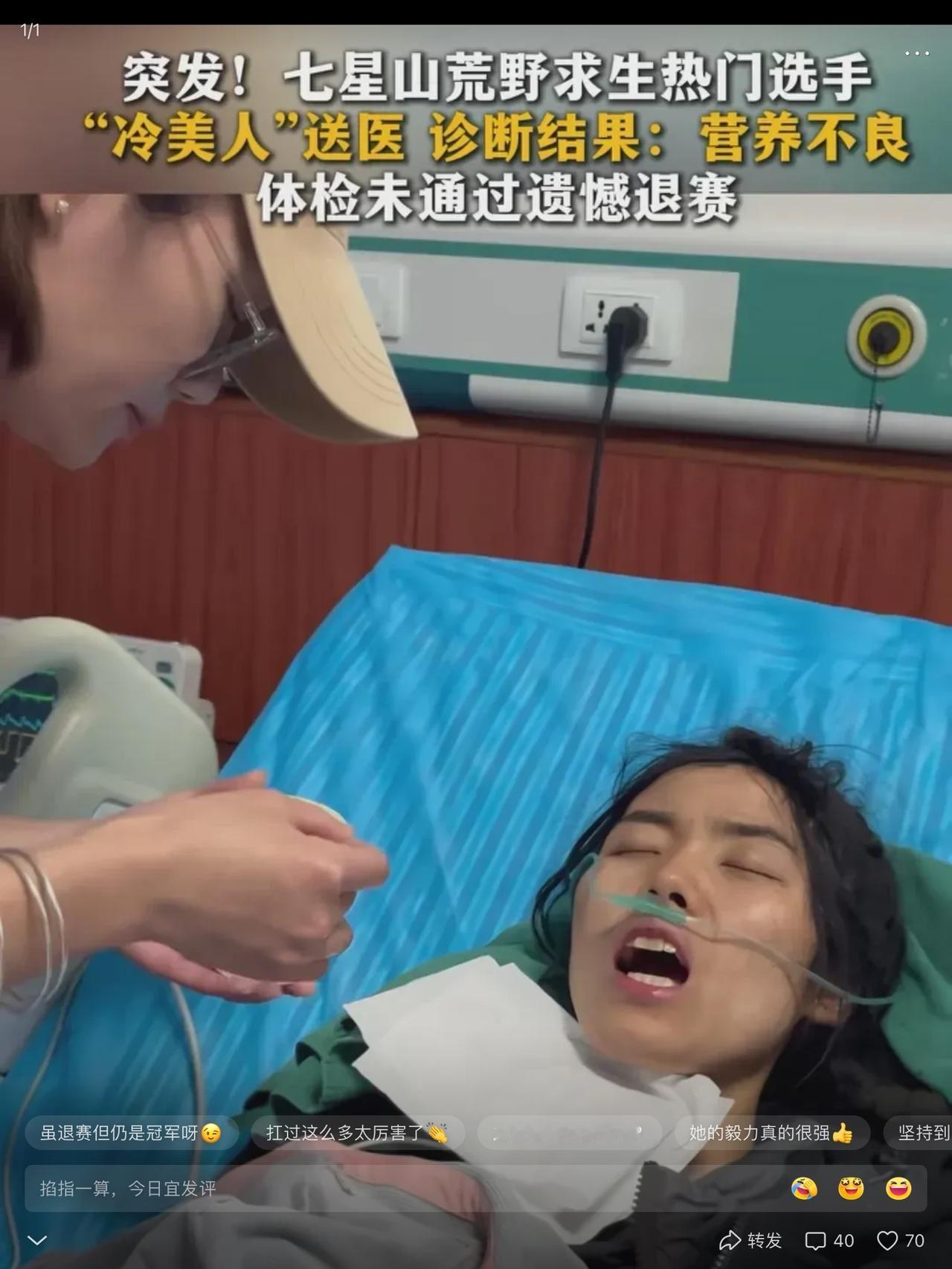 冷美人退赛了!想过她得不到第一名。却不曾想过她因为什么退赛。如果是她自己,她是要撑下去的。她不是个轻易认输的人。 不曾想以这样一种被动的形式,晕倒了,而退赛。可能不是她本意,但是以生命为本是对的。有了这个本体,才有后来的一切。 现在流量有了,代言,带货都不成问题。有钱就赚吧!那么苦,为了什么。都能理解。 这样一个努力的人,还有两个儿子要养。加油!