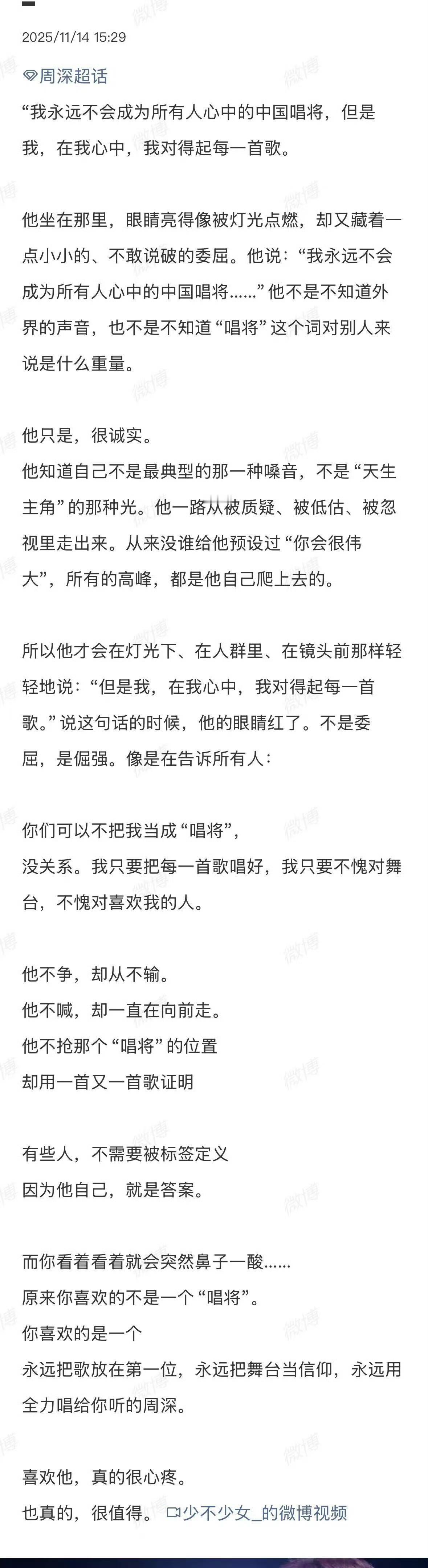 听到周深哽咽着说“我对得起每一首歌”时瞬间破防。这不是一句轻飘飘的承诺,而是他用每个音符垒起的信仰。或许正是见过音乐最纯粹的模样,才会在追寻完美的路上如此执着动人。