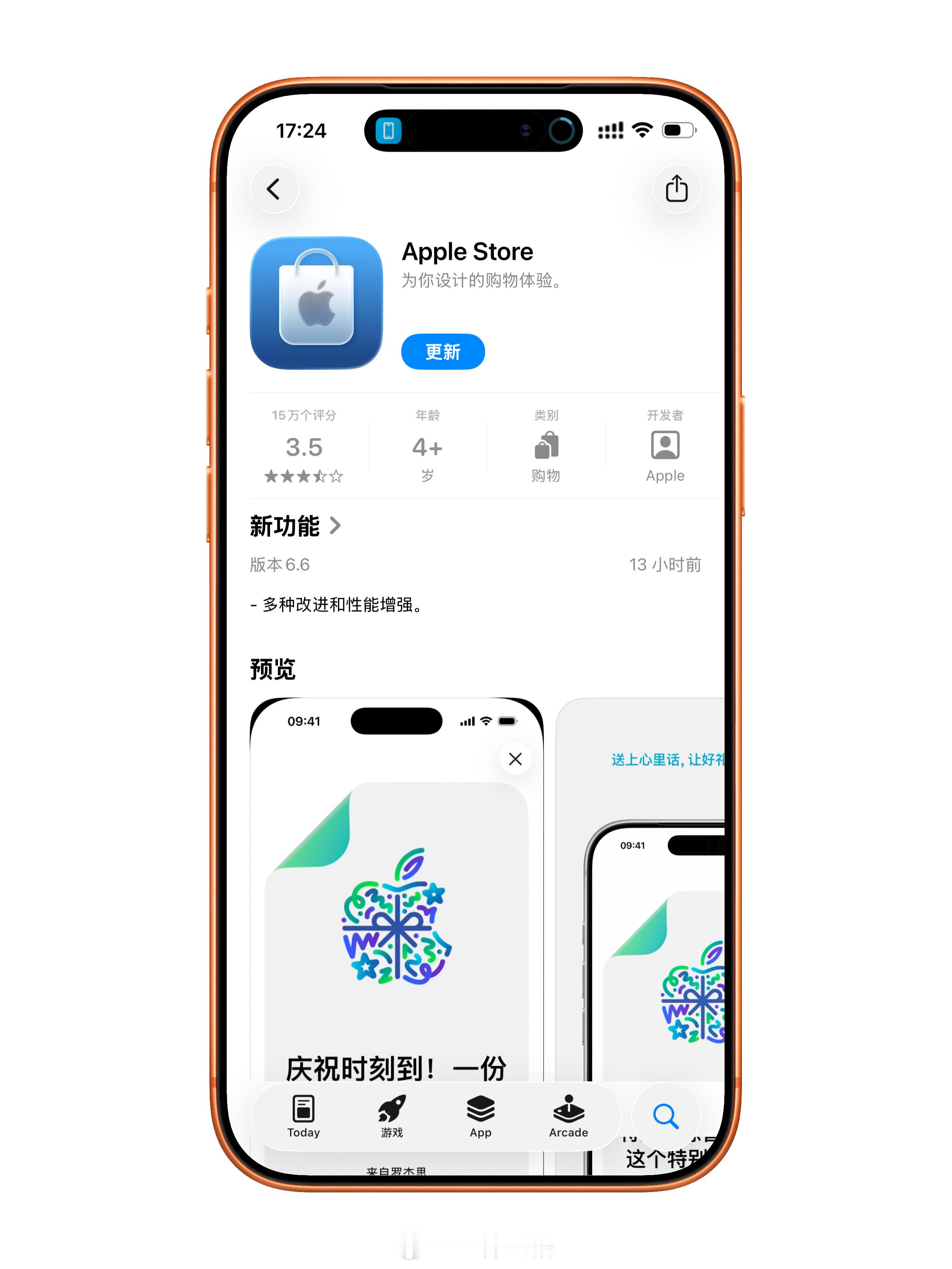 苹果AppleStore更新,换了图标,适配了iOS26液态玻璃。