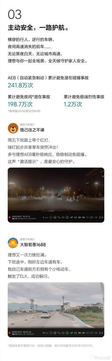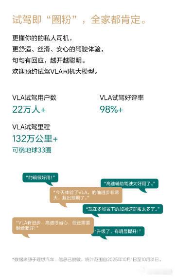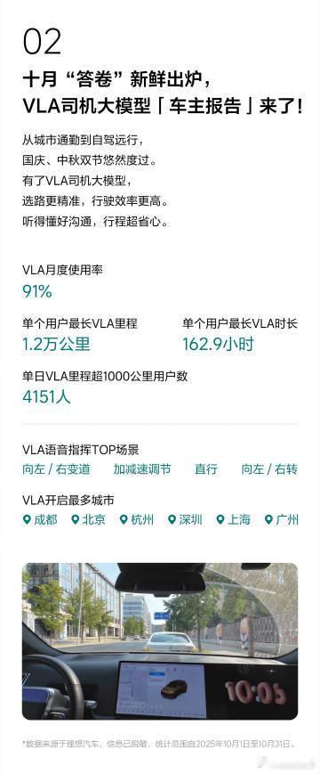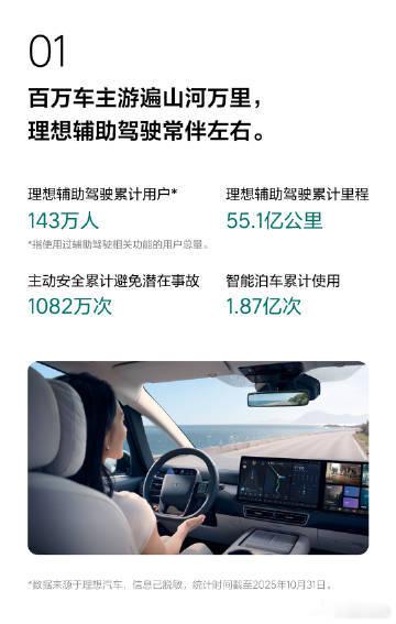 理想辅助驾驶10月出行报告截至10月31日,理想辅助驾驶累计里程55.1亿公里,主动安全累计避免潜在事故1082万次。从城市通勤到自驾远行,VLA陪伴车主悠然度过国庆、中秋双节,单日VLA里程超1000公里用户数4151人。