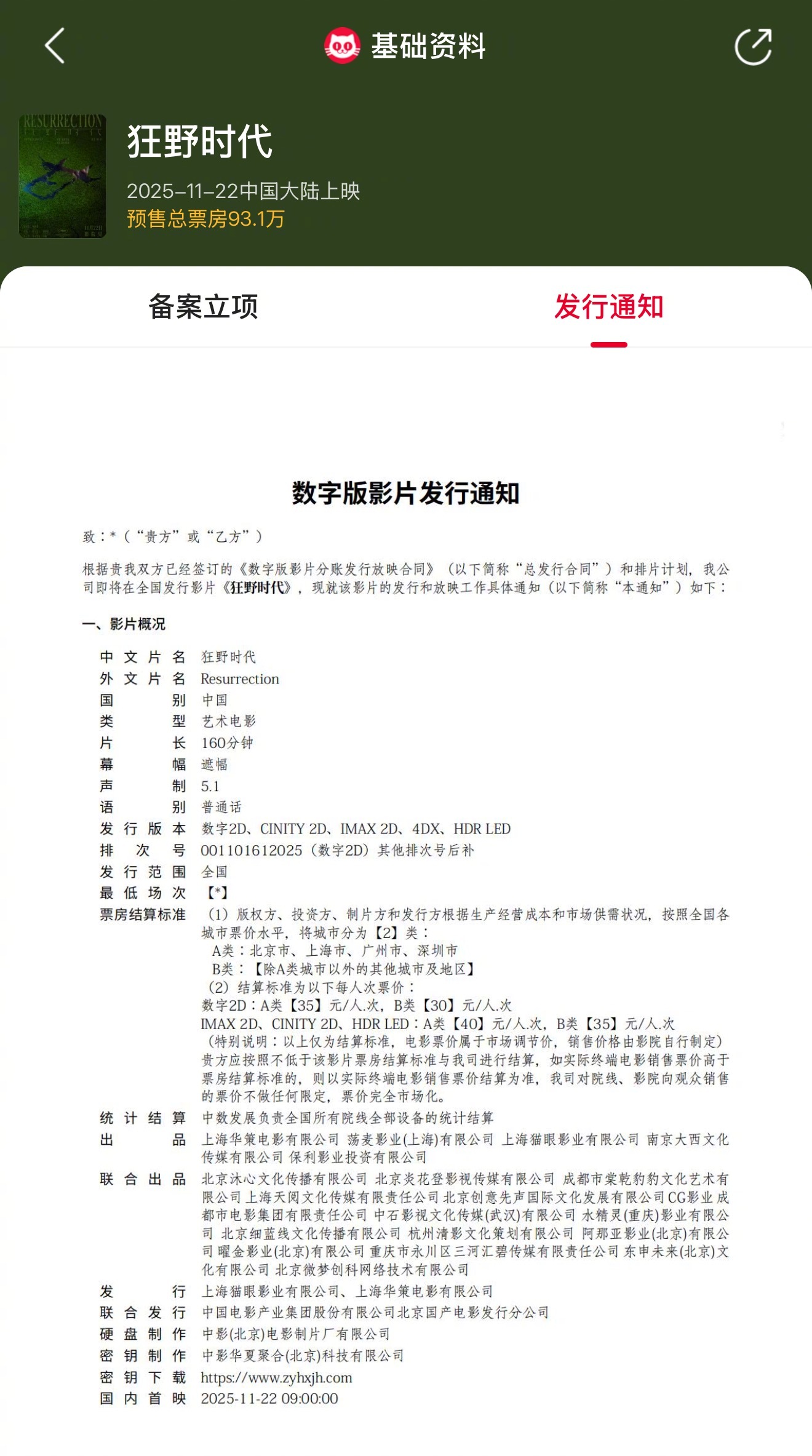 据猫眼专业版数据,易烊千玺、舒淇领衔主演电影《狂野时代》发行通知已出,片长160分钟,影片将于11月22日全国上映。