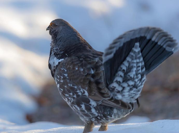 蓝松鸡是一种体型较大的松鸡,主要分布于北美洲的美国和加拿大。 雄鸟体长47-57厘米,平均重245克;雌鸟体长44-48厘米,平均重850克。 雄鸟多为灰色或石板色,繁殖期胸部两侧会露出被白羽环绕的红斑,尾部呈扇形张开;雌鸟羽毛斑驳,以褐色为主。嘴爪均为黑灰色,雄鸟在繁殖期眼梳呈黄橙色。 蓝松鸡被《世界自然保护联盟濒危物种红色名录》列为无危(LC)物种,种群数量稳定。