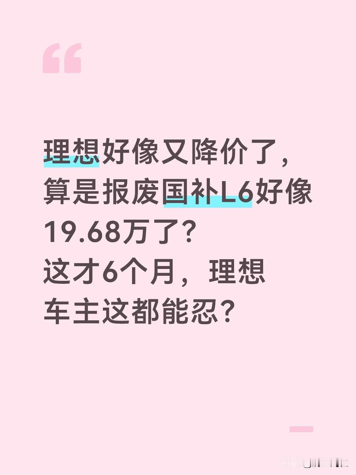 理想好像又降价了,算是报废国补L6好像19.68万了?这才6个月,理想车主这都能忍?