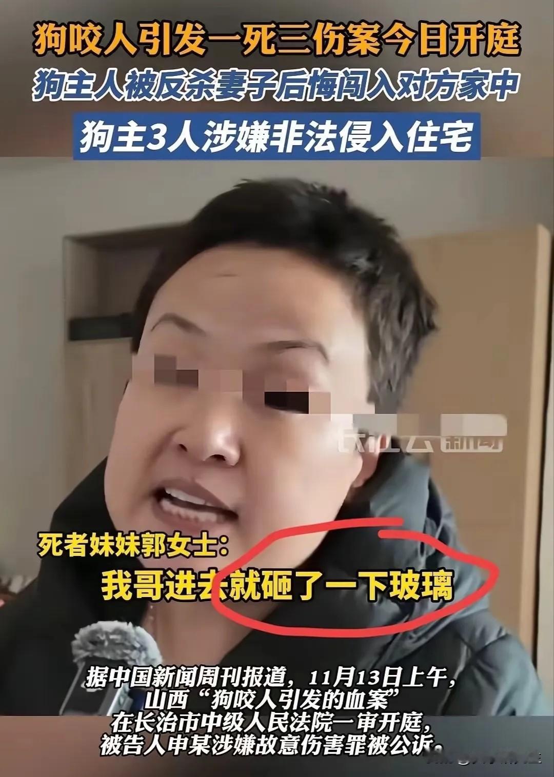 山西那起狗咬人引发的命案, 死者郭某的妹妹站了出来 她对着镜头一把眼泪一把鼻涕, 口口声声说哥哥只是砸了块玻璃,死得冤。 可另一边,申家的女儿也憋着一肚子委屈,说她六十岁的老父亲被郭家一帮人堵在墙角揍,鼻梁骨都断了,这妹妹说他们就是去讨个说法,没想动手。 但申家女儿记得清楚,那天晚上哐哐的砸门声,玻璃碎了一地,好几口子人冲进他们家院子。就连帮忙劝架的邻居都拉不住。两边各执一词,话都让你说尽了。 当初狗咬了人,申家儿子气不过摔死了狗,事后是想找郭家商量着办的,可郭家那边,电话里甩过来的话是,人还不如他家的狗值钱。 这话听着就让人寒心,派出所打电话调解,郭家媳妇也因为对方电话里态度凶,不肯去。一来二去,小事就憋成了大事。郭家妹妹哭诉哥哥是家里的顶梁柱,他这一走,天塌了。可她大概忘了,那天晚上她哥哥是带着一帮亲戚,拿着铁锹棍棒上的门。 申家老两口和女儿在里面,吓得门都不敢开,一晚上报了五次警。 这哪是去理论,这阵仗谁看了不害怕,现在出事了,郭家妻子后悔了,说不该去砸那块玻璃。 可后悔有什么用呢? 一条狗,闹得一条人命没了,一个家碎了,另一个家也可能有人要坐牢。 但凡当初有一边能稍微退一步,也不至于此。