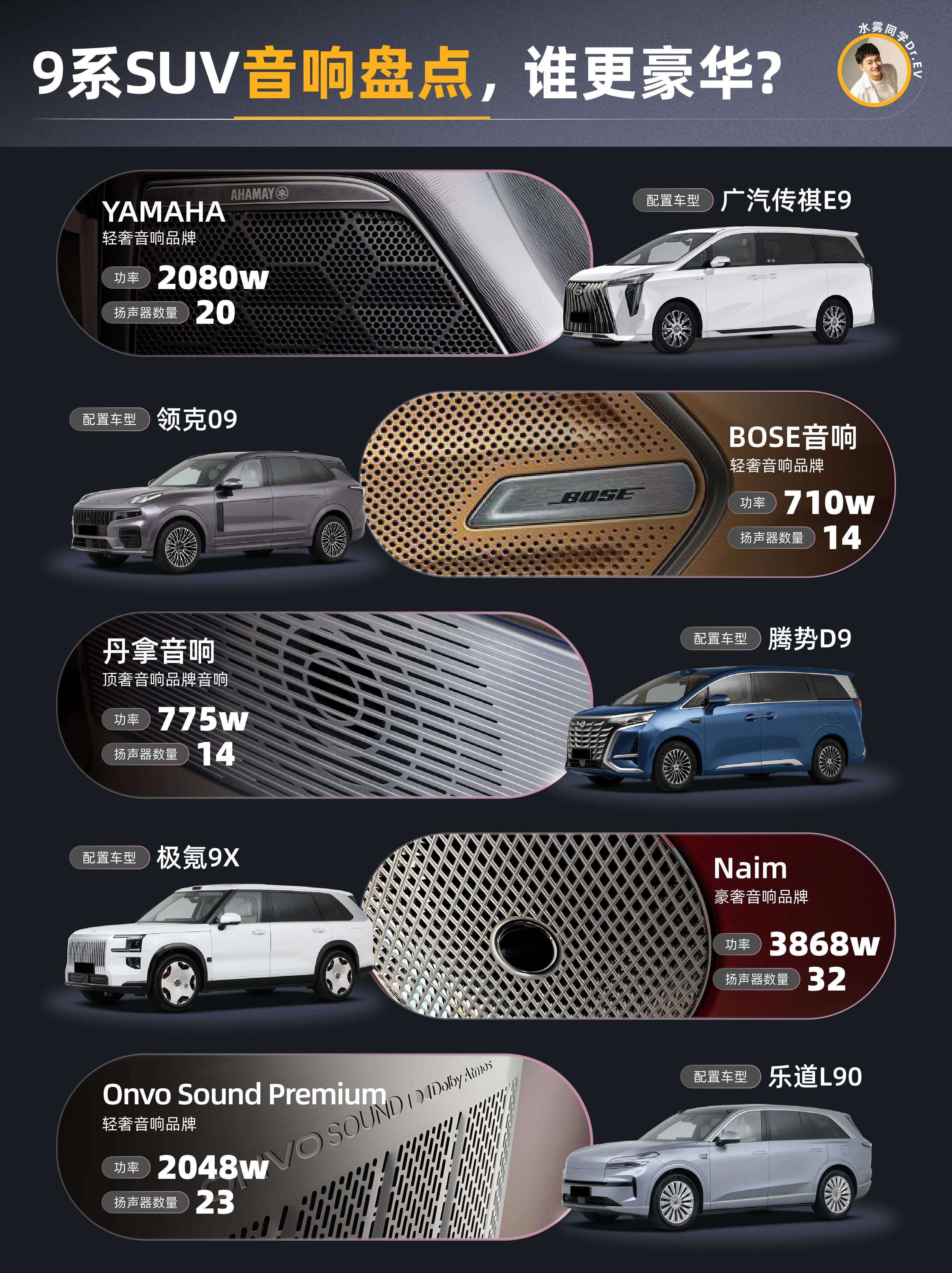 盘点国产9系车型的音响品牌及功率。个人认为:先不说调音以及软件算法。功率越高、喇叭越多,音质越好。你同意吗?欢迎朋友们晒自己汽车的音响品牌和使用感受!