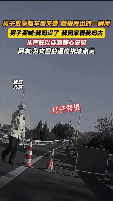 真是太暖心了!北京一男子应急超车,被交警拦下,当交警把警棍甩出来的那一瞬间,男子对着交警哭喊:“警官,我妈没了,我回家看我妈去。” 交警一听这话,没多说啥,默默把警棍收起来了,问他:“回哪儿啊?” 男的哽咽着说:“通州。” 交警接着说:“我给你报一下情况。” 男的连忙说:“谢谢。” 之后交警就用对讲机跟同事通报了这事,那男的在一边一直哭,看着就让人揪心——中国人最怕的就是半夜突然来电话,多半没好事。 通报完之后,交警就放他走了,还特意安慰他:“慢点开啊,节哀。不好意思啊刚才,您路上慢点。” 男的又说了句“谢谢”才开车走。 有网友说:“这事儿要是真的,我希望是假的;要是假的,我倒希望是真的。” 看那男的哭得多伤心,大概率是真的。家里遇上白事,着急回家的心情能理解,但赶路也得注意安全。必须给这交警点个赞,这才是有人情味的人民警察啊!