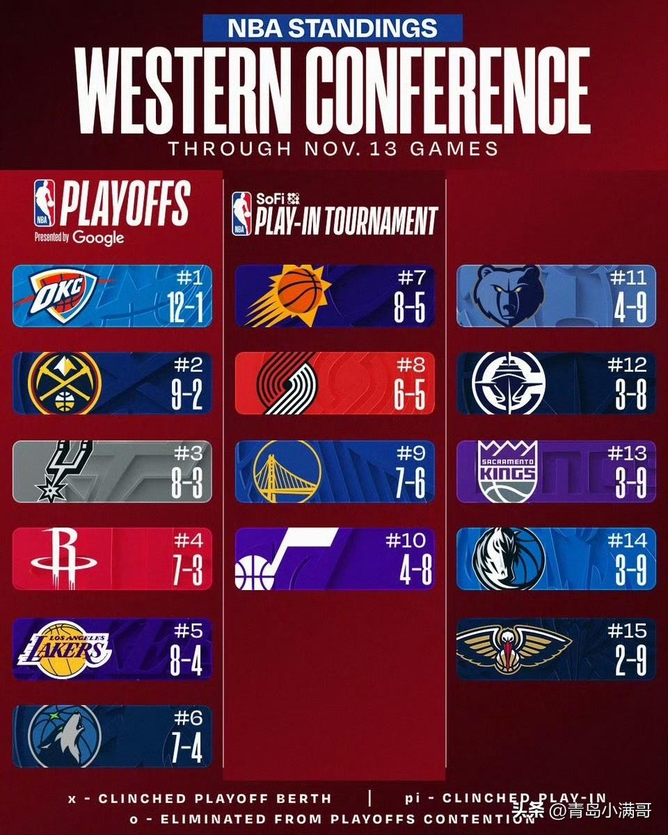 东西部最新战绩!!!老鹰升至第五,猛龙升至第六,太阳第七! 北京时间11月14