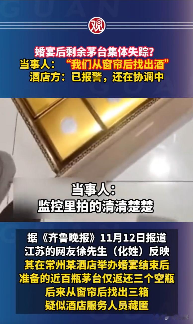 江苏常州,一男子在酒店办婚宴,自带了近一百瓶茅台酒。婚宴结束后,男子向酒店索要剩下的茅台酒,可酒店仅返还了3个空瓶。蹊跷的是,男子在男女方宴桌旁的窗帘后,陆续翻出三箱茅台,有整瓶、半瓶、空瓶混杂其中。男子怀疑酒店员工有藏匿茅台的行为,酒店方面则愤怒否认这一指控,双方均报警处理。 徐先生准备办婚礼,经过精心挑选,最终选择了一家知名酒店的三楼宴会厅作为婚宴场地,这家酒店在当地小有名气,以服务周到著称。 为了有面子,提高这次婚宴的档次,也让宾客们能够吃好喝好,徐先生特意自备了近100瓶茅台酒。 2025年10月25日,婚宴当天,大厅里热闹非凡,宾客云集,徐先生安排了几位亲友负责看管酒水,但亲戚实在太多了,根本管不过来。 婚宴中,茅台酒被陆续打开,供宾客享用,不过有些桌的客人并没怎么喝酒,甚至有几桌根本未动酒瓶,酒水有剩余。 然而,徐先生忙碌中无暇细查,直到晚宴结束,宾客渐渐散去,徐先生才开始清点物品。 这时,徐先生首先向酒店服务人员索要剩余的茅台酒,可多次追问,酒店方最初只拿出了3个空酒瓶。 徐先生大为不解,近100瓶酒,怎么可能只剩下空瓶?他心中升起一丝不安,直觉告诉他,事情没那么简单。 徐先生不是个轻易放弃的人,他坚持要求酒店进一步检查,并亲自在宴会厅内搜寻。 徐先生走到女方宴桌旁的窗帘后,意外发现了两箱茅台酒。接着,在男方宴桌旁的窗帘后,又找到一箱。 这些酒箱里,有整瓶未开的、有喝了一半的,也有空瓶,总计三箱。 徐先生顿时火冒三丈,监控里拍得清清楚楚,酒是从窗帘后搬出来的,在他看来,酒店服务人员可能趁乱将酒藏起,意图事后占为己有。 11月12日,酒店工作人员坚决否认偷藏酒的行为,还指责徐先生是在引导不明真相的人去理解为酒店服务员偷藏酒,对此,酒店方表示十分愤怒。 事后,酒店方和徐先生均报了警。 目前,案件正在进一步侦办中。 那么,从法律角度,这件事如何看待呢? 1、酒店方可能要承担违约赔偿责任。 《民法典》第五百七十七条规定:当事人一方不履行合同义务或者履行合同义务不符合约定的,应当承担继续履行、采取补救措施或者赔偿损失等违约责任。 徐先生在酒店预订婚宴,酒店提供服务,徐先生与酒店之间成立了事实上服务合同关系。 基于诚信原则,酒店除了提供场地、餐饮等主合同义务外,还负有对徐先生携带的、置于其控制范围内的贵重物品的合理保管义务。 徐先生自带近百瓶茅台酒在酒店宴会厅消费,这些酒水就处于酒店的经营场所和管理范围之内,酒店作为服务提供方,有责任采取合理措施保障这些财物的安全,防止遗失或被盗。 如果事实如徐先生所述,是酒店员工将酒藏于窗帘后,那么酒店显然未尽到保管义务,甚至存在重大过错,构成违约。 即使非员工故意藏匿,而是因酒店归置物品流程不规范等原因导致酒水被误放、遗忘在窗帘后,且在被询问时仅返还3个空瓶,未能及时、完整地找到并归还,也属于履行合同义务不符合约定,即存在违约行为。 因此,无论酒店员工是否存在主观故意,只要法院认定酒店未能尽到合理的保管义务,导致徐先生的酒水丢失,酒店就应承担违约赔偿责任,赔偿徐先生相应数量的茅台酒或等值价款。 2、徐先生的酒水如系酒店职工故意藏匿的,则该行为还构成侵权行为,甚至涉嫌治安责任、刑事责任。 一方面,《民法典》第一千一百六十五条规定:行为人因过错侵害他人民事权益造成损害的,应当承担侵权责任。 如果酒店员工故意藏匿,则存在明显过错,构成侵害徐先生的酒水,属于侵权责任。 如果因酒店管理疏忽导致,如未培训员工妥善处理客人遗留物品,工作流程有漏洞,酒店也存在过错。 作为用人单位,酒店应对其员工在执行工作任务时造成的损害承担侵权责任。 在这种情况下,徐先生可以选择违约责任或侵权责任向酒店主张权利,以维护自身合法权益。 另一方面,《治安管理处罚法》第四十九条规定:盗窃……处五日以上十日以下拘留,可以并处五百元以下罚款;情节较重的,处十日以上十五日以下拘留,可以并处一千元以下罚款。 如果公安机关调查后,查明确有酒店工作人员利用工作便利,将徐先生的茅台酒水故意藏匿,意图非法占有,但其行为可能因数额未达到刑事立案标准,或情节显著轻微,那么该行为可能被认定为治安违法,而非犯罪,公安机关可对涉事人员处以拘留、罚款等行政处罚。 此外,《刑法》第二百六十四条规定,盗窃公私财物,数额较大的,……处三年以下有期徒刑、拘役或者管制,并处或者单处罚金。 可见,一旦查实酒店工作人员有将徐先生这些酒水据为己有的目的,且酒水价值超出法定数额较大的标准,则将构成盗窃罪,可能被追究刑事责任。 对此,您怎么看?