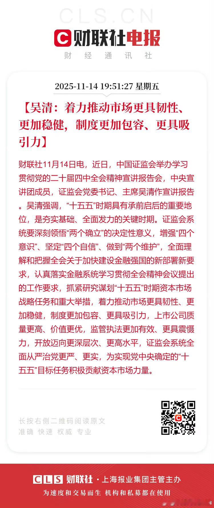吴清:着力推动市场更具韧性、更加稳健,制度更加包容、更具吸引力。