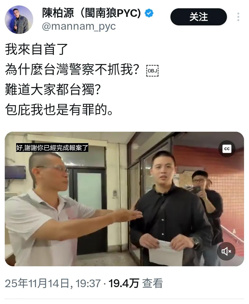 “台独”分子陈柏源昨日(11月14日)发文写道:我来自首了,为什么台湾警察不抓我?难道大家都台独?包庇我也是有罪的。 [机智]评几句: 陈柏源这番自作聪明的叫嚣,不过是困兽犹斗的跳梁小丑。这个曾靠大陆市场吃饭的两面人,如今却恩将仇报、吃里扒外,抹黑惠台政策,彻头彻尾的汉奸卖国贼。所谓“为什么不抓我”的挑衅,实则是色厉内荏。福建公安已对其立案悬赏通缉,法网恢恢、终身追责,别看他如今气焰嚣张,待缉拿归案之日定将牢底坐穿。白家父子、黎智英的前车之鉴历历在目,陈柏源的结局不会有任何例外!