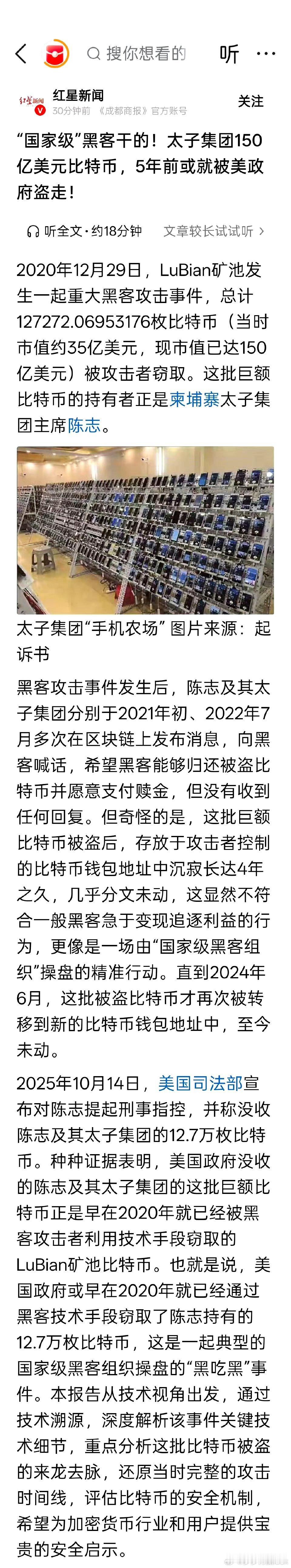 太子集团,发表严正声明,12.7万比特币,五年前就被美国国家级黑客组织盗走了。