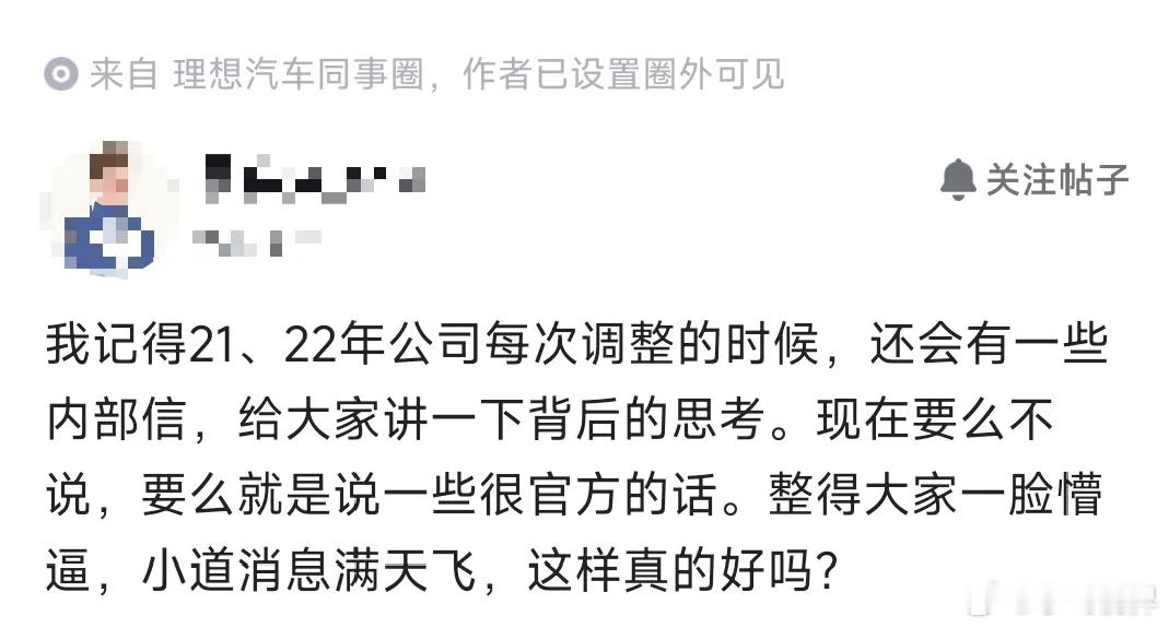 理想这两年组织调整挺频繁的,连理想汽车员工都说:我记得21、22年公司每次调整的时候,还会有一些内部信。现在要么不说,要么就是说一些很官方的话。