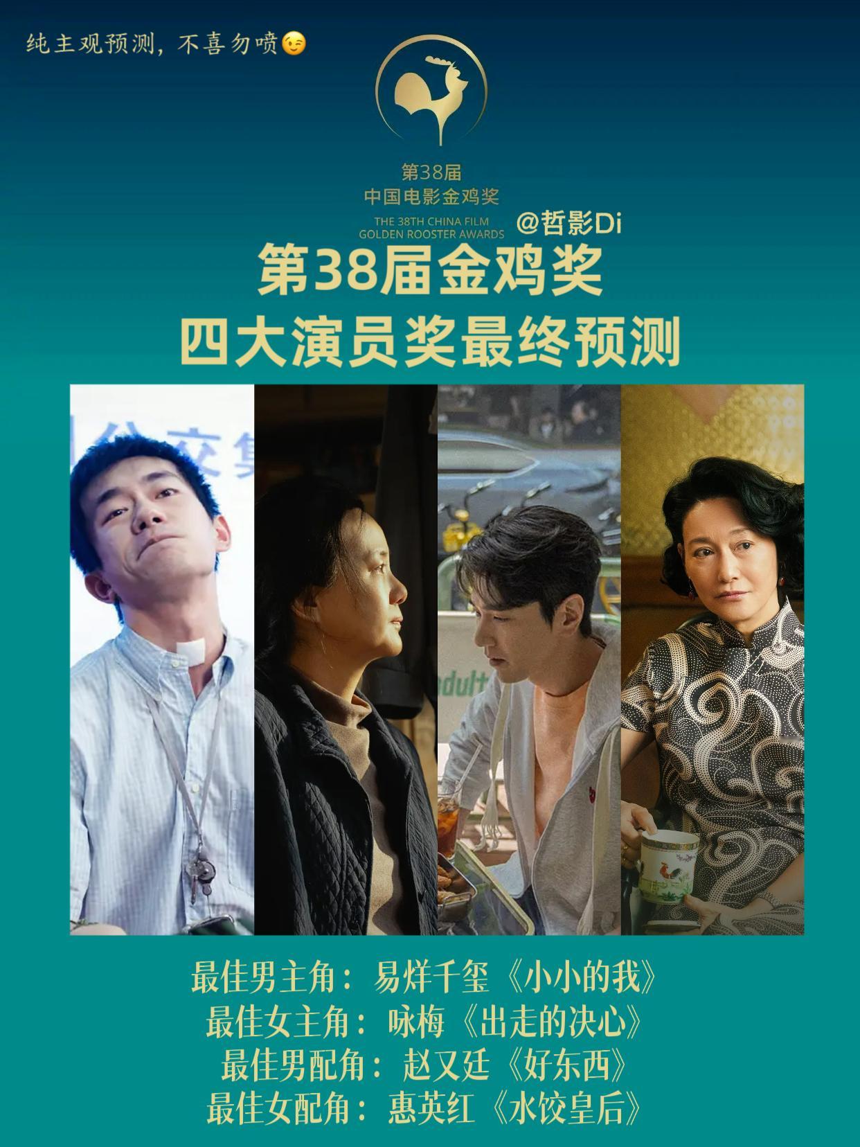 第38届金鸡奖今晚举行颁奖典礼,根据这两天的一些风向,还有我个人的喜好,做一个终极预测,期待今晚会有实至名归的结果。最佳故事片:《好东西》评委会特别奖:《唐探1900》最佳中小成本故事片:《但愿人长久》最佳外语片:《还有明天》(意大利)最佳美术片:《哪吒之魔童闹海》最佳编剧:邵艺辉《好东西》(原创)最佳导演:董成鹏《长安的荔枝》最佳导演处女作:高朋《老枪》最佳男主角:易烊千玺《小小的我》最佳女主角:咏梅《出走的决心》最佳男配角:赵又廷《好东西》最佳女配角:惠英红《水饺皇后》最佳摄影:鲍德熹、蔡文龙、周志辉、叶振《蛟龙行动》最佳录音:富康《老枪》最佳美术:刘山《只此青绿》最佳音乐:翟锦彦《长安的荔枝》最佳剪辑:廖庆松《青铜葵花》