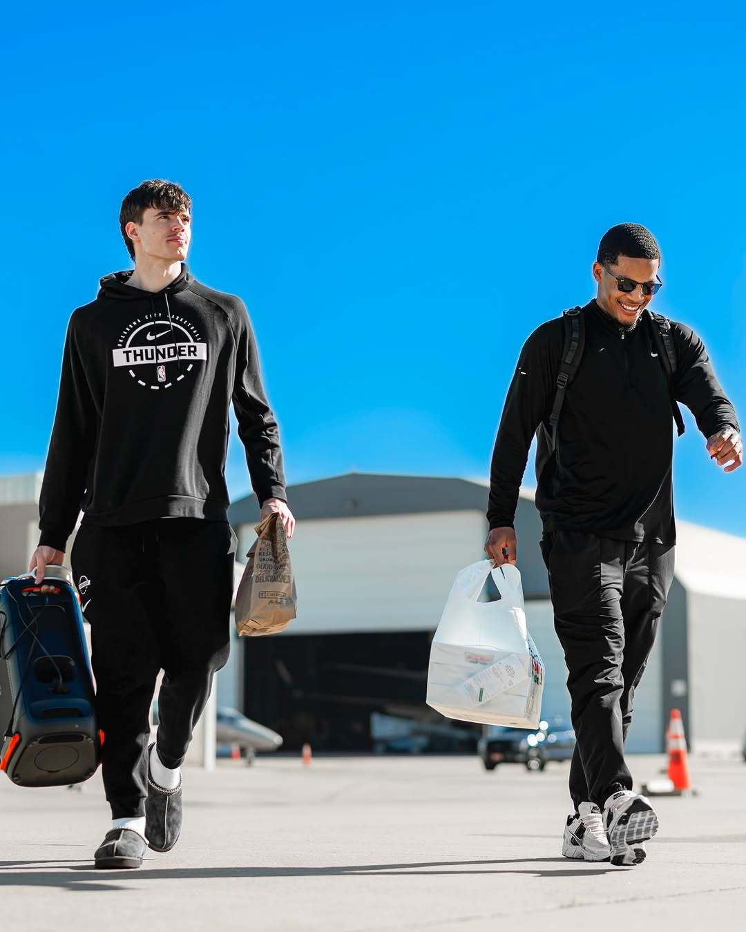 雷霆队已经飞抵夏洛特开启两连客,巴恩海泽这是行李都没拿光拎音响了?