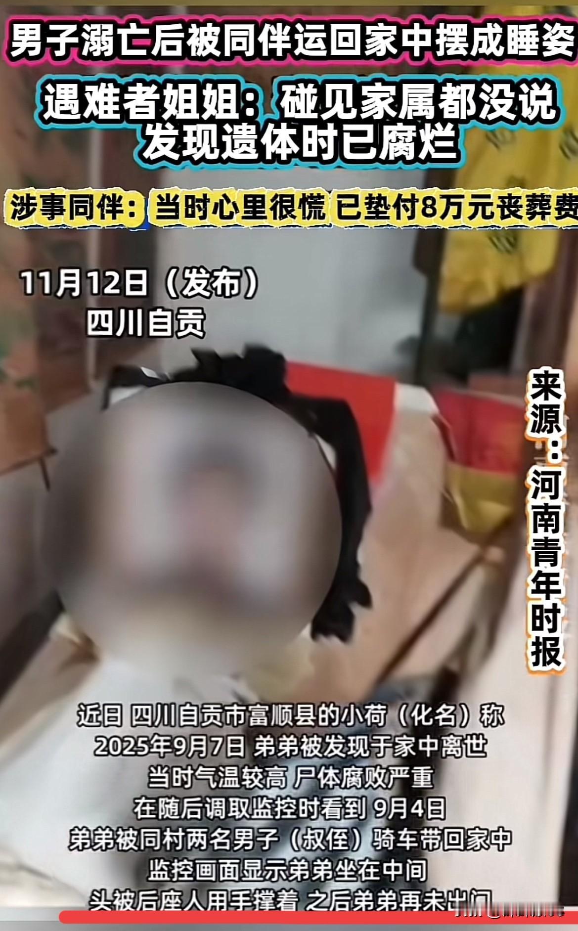 天呐,刚醒就刷到这条新闻,真不敢相信还有这种事! 三人一起出去玩,其中一个自己下水库游一圈意外淹死了,另外两个因为害怕恐慌,就装模作样的把死者扶着头坐车上送回家中!途中遇见死者父母都没有说溺水的情况[打脸],更离谱的是死者家人在三天后才发现死者已经在家中腐烂…… 最后赔偿八万元,因为尸检是生前溺亡,未立案!不得不说这两个人也真的是大胆,但这种行为真的不可取,大家遇到可要第一时间报警哦🙏