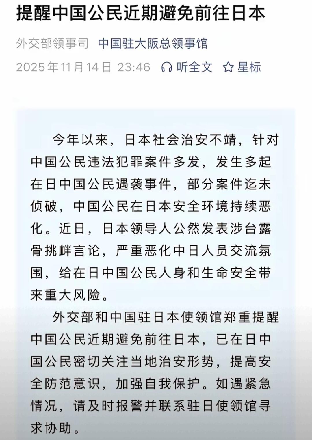 大阪总领事馆深夜警示! 11月14日深夜,我国驻大阪总领事馆突然发布紧急通知,明确提醒中国公民近期避免前往日本旅行,核心原因就是当地公共安全状况已到了不容忽视的地步。 这份深夜出炉的警示,透着“事态紧急、信号强烈”的意味,要知道日本外务省傍晚还轻描淡写,显然没认清问题严重性,而我方这份“夤夜警示”,早已超越单纯的安全提醒,更是对日方一系列挑衅的强硬回应,标志着中方已跨过“口头警告”,进入“启动实质性反制措施”的预备阶段。 这一切绝非凭空而来,根本原因还是日方近期的步步紧逼。日本首相高市早苗公然在国会宣称“台海有事”构成“存亡危机事态”,还暗示要行使集体自卫权,这种直接干涉中国内政的挑衅言论,彻底恶化了中日关系氛围。 受此影响,日本国内针对中国公民的歧视性言论和极端情绪抬头,右翼分子甚至发出威胁,驻日使馆都已要求人员尽量避免外出,在日同胞的安全环境持续变差。 更让人揪心的是,日本本土安全风险早已多重叠加。今年以来,针对中国公民的遇袭、诈骗案件频发,部分遇袭案至今未破,诈骗分子还专门盯着留学生、技能实习生下手。 社会治安乱局之外,自然风险也不断,2025年仅四个多月地震就超1800次,11月以来东京等地多次有明显震感,多地还因熊袭人事件频发,让警察都开始用步枪驱熊。更别提玄海核电站遭无人机闯入,暴露核安全漏洞,这些都让旅行风险陡增。 中方的警示,本质是对公民生命财产安全的负责,也是对日方的严正施压。日方若还执迷不悟,不纠正涉台海错误言论,不切实保障在日中国公民安全,中方的反制绝不会只停留在“提醒”层面。 说到底,中日关系稳定需要双方共同维护,日方若持续挑衅,终将为自己的行为付出代价,而我们能做的,就是听从提醒,守住自身安全底线。中国驻日本 日本大坂总领馆 北京日本大使馆