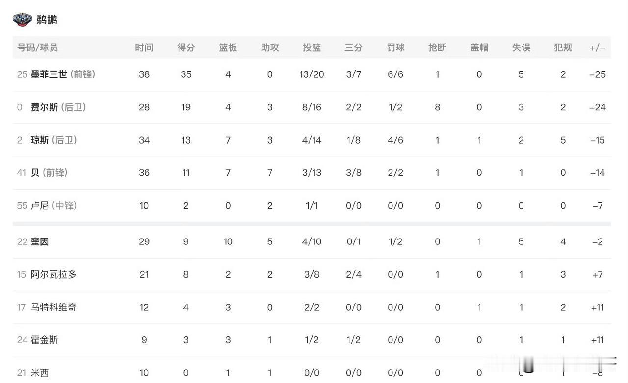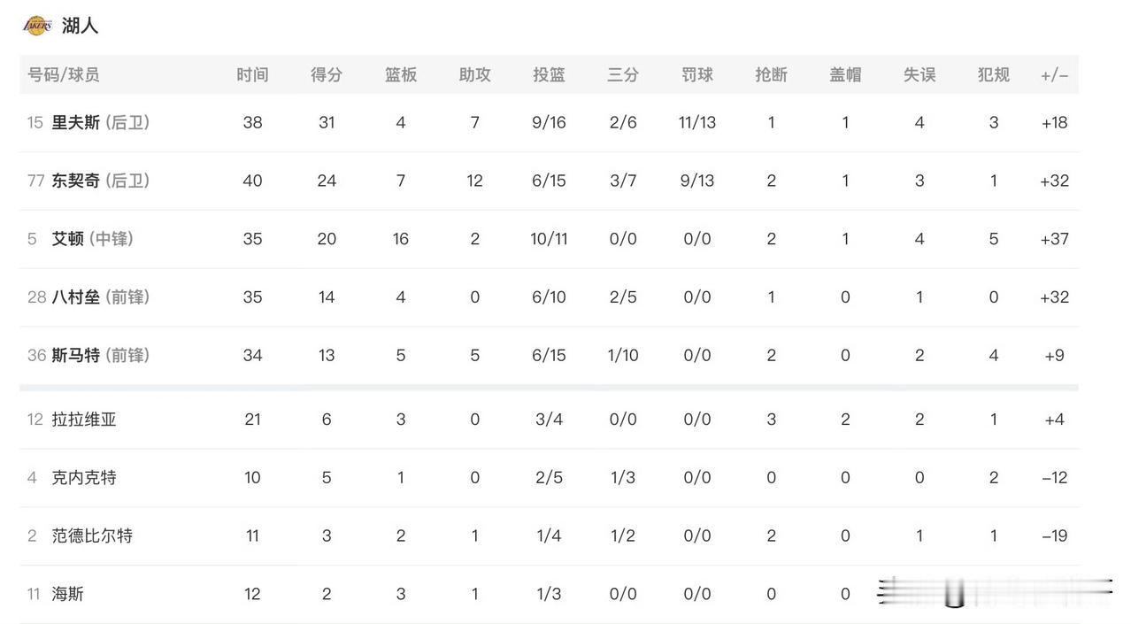 有惊无险!!!湖人客场胜鹈鹕,吓出一身冷汗! 在刚刚结束的一场比赛中,湖人118-104客场大胜鹈鹕,有惊无险的从客场再拿走一场胜利。 湖人方面,东契奇24+7+12,里夫斯31+7,艾顿11中10表现出色,拿下20分16篮板,首发全部上双,三人20+,替补无一人上双。 鹈鹕方面,墨菲35分,首发五人四人上双,替补也无人得分上双。 本场比赛蒂耶罗复出,但是很遗憾他没有得到任何机会,比较遗憾。 湖人本场比赛还是给球迷吓出来一身冷汗,也让球迷们再次意识到湖人无论打哪支球队,强队还是弱队都是五五开,不能过于信任他们。 湖人 nba 湖人 湖人赛程 湖人比赛 东契奇 里夫斯