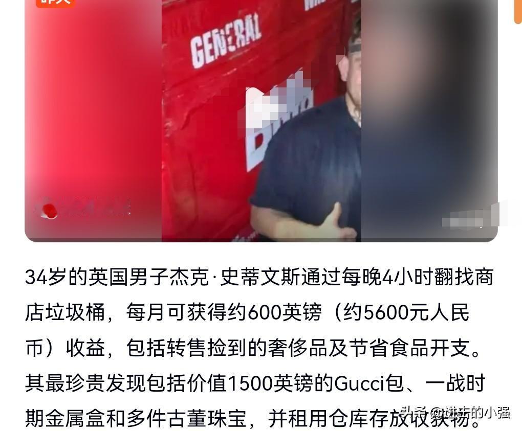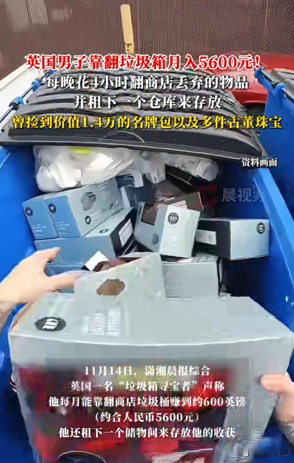 其实捡垃圾也是能够养活自己的,无论是在中国还是国外,养活自己一个人是没问题的。 11月14日有媒体报道,英国男子每天翻垃圾箱,月入5600元。 那真的是相当的厉害了。 就这个钱,在中国,已经一个人够用了。 而且中国人有很多人的工资都没有达到5600块。 中国很多工资,有的甚至达不到4000块。 英国男子每天翻垃圾箱 月入5600元