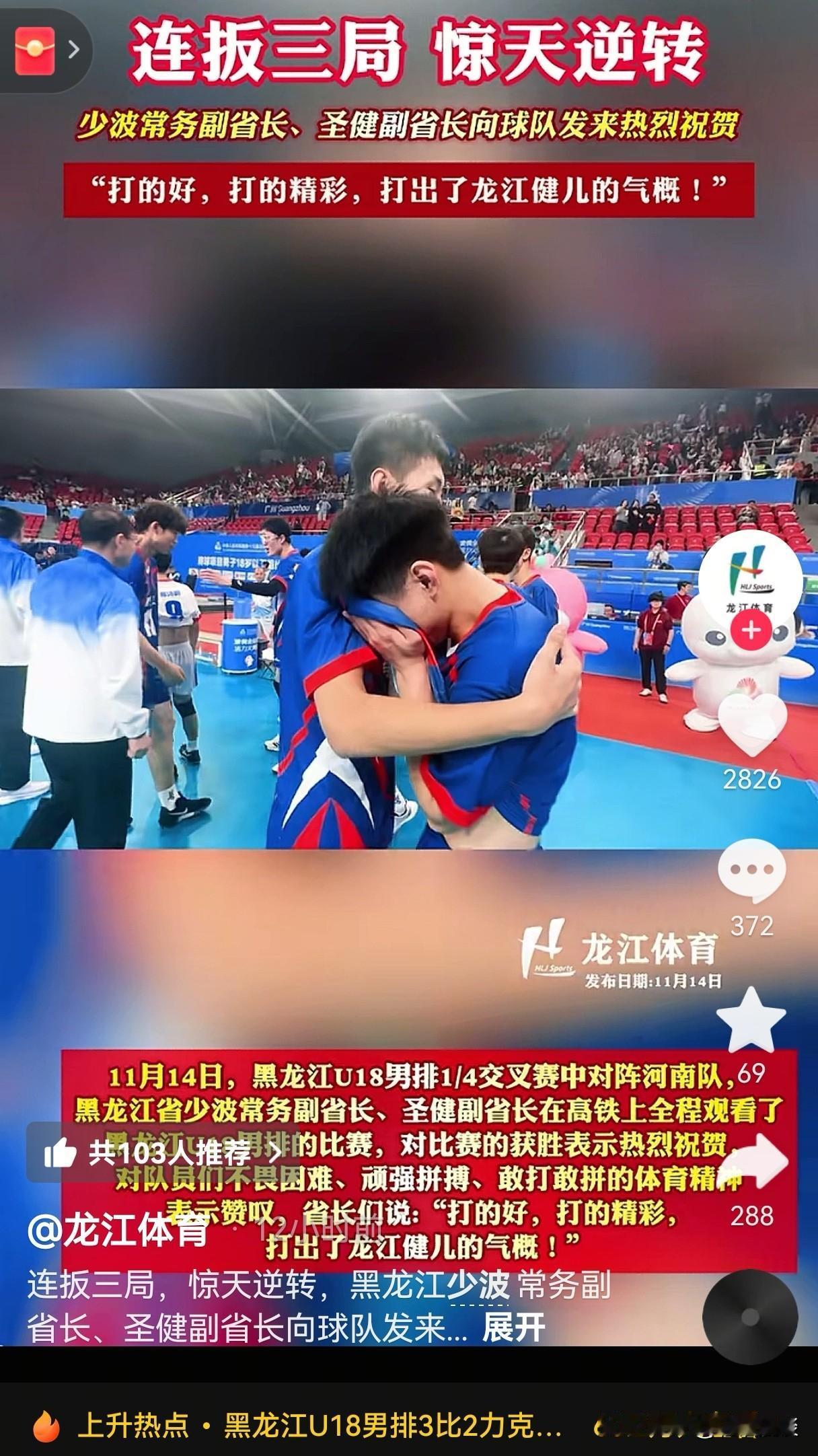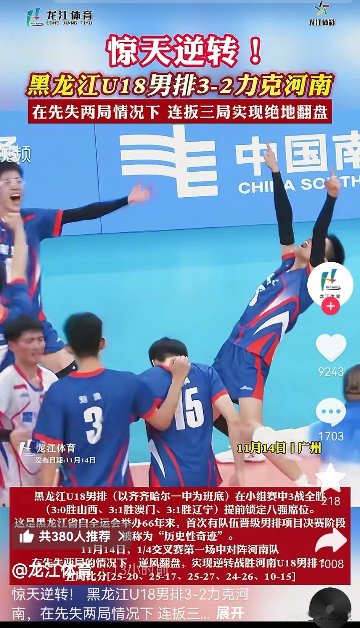 赛场,永远是奇迹诞生的地方。 赛场,也从不会辜负拼尽全力的人。 全运会男排1/4决赛,面对实力强劲的河南队,黑龙江的这帮小伙子们在不被看好的情况下,苦战五局,以 3:2 实现逆风翻盘,历史性地杀入四强。 这也是黑龙江省66年来首次闯入全运会男排四强,更是一支"学生军"硬刚专业梯队的奇迹。 这一刻,不只是赢了一场球,更像是剥开了长久以来笼罩在头顶的阴云。 赛后,包教练在接受采访时,没能忍住泪水。这位扎根排球二十年的老帅,声音哽咽,他说:“东北虎,下山了。” 一句“东北虎下山”,说出了多少心酸。这些年,东北人才外流,经济遇冷,竞技体育的路走得更是不易。 这支校园球队没有专业梯队的资源,全靠教练日复一日的坚守和孩子们课余时间的苦练。 队员们说"辛苦只有自己知道",但身为东北人,就是要在绝境里拼出条路。 他们拼的不仅是技术,更是一口气。是一种“哪怕没人看好,我也要证明给你看”的倔强,是一种扎根寒土、却始终向阳而生的生命力。 这场比赛,赢得提气,赢得让人热泪盈眶。东北虎从未离开,它只是在一旁磨利了爪牙,等待下山的那一刻。 今天,这群少年,就是那一声震撼山林的虎啸。 全运会男排 龙江 黑龙江 全运会 东北 东北 黑龙江男排 黑龙江男排