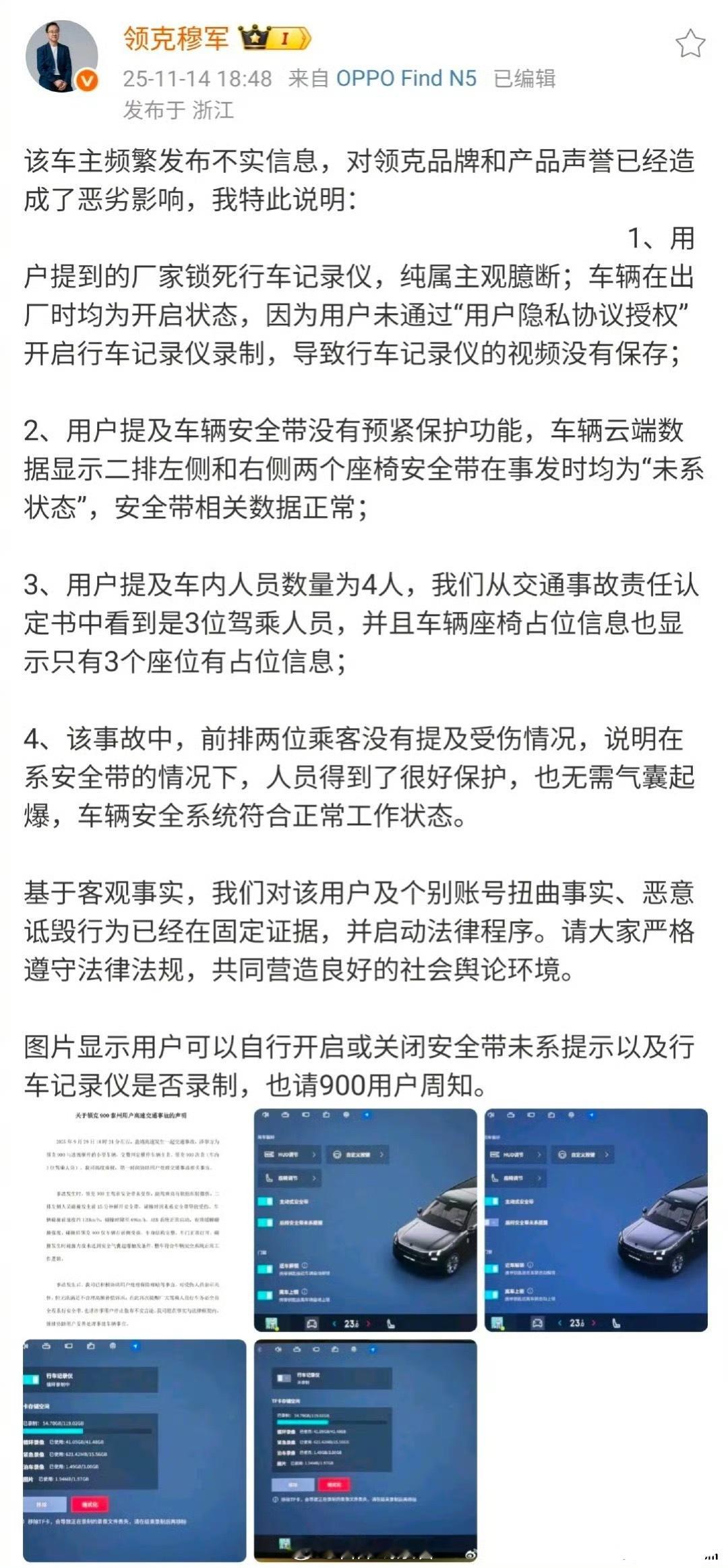 领克 900 在盐靖高速发生事故,二排乘客因未系安全带导致九级伤残。领克官方回应称,车辆安全系统正常工作,安全带状态数据显示未系。前排乘客因系安全带未受伤。