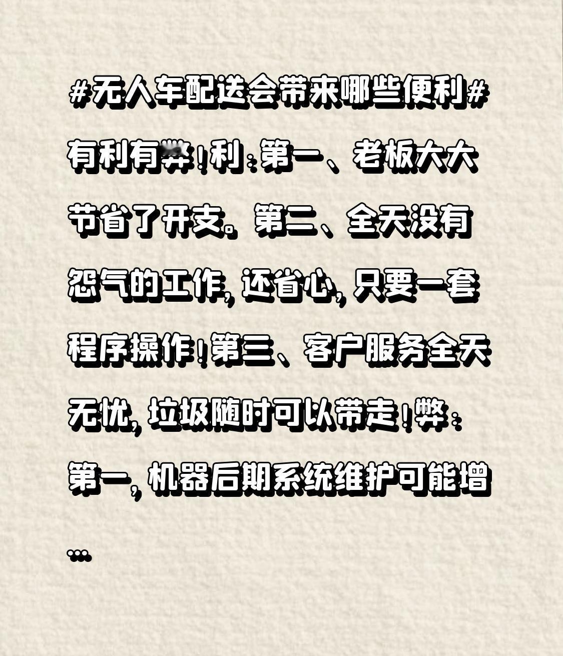 利: 第一、老板大大节省了开支。 第二、全天没有怨气的工作,还省心,只要一套程序操作! 第三、客户服务全天无忧,垃圾随时可以带走! 弊: 第一,机器后期系统维护可能增高。 第二,道路出现的问题无法预估。 第三,城市道路可能高峰期产生拥堵。