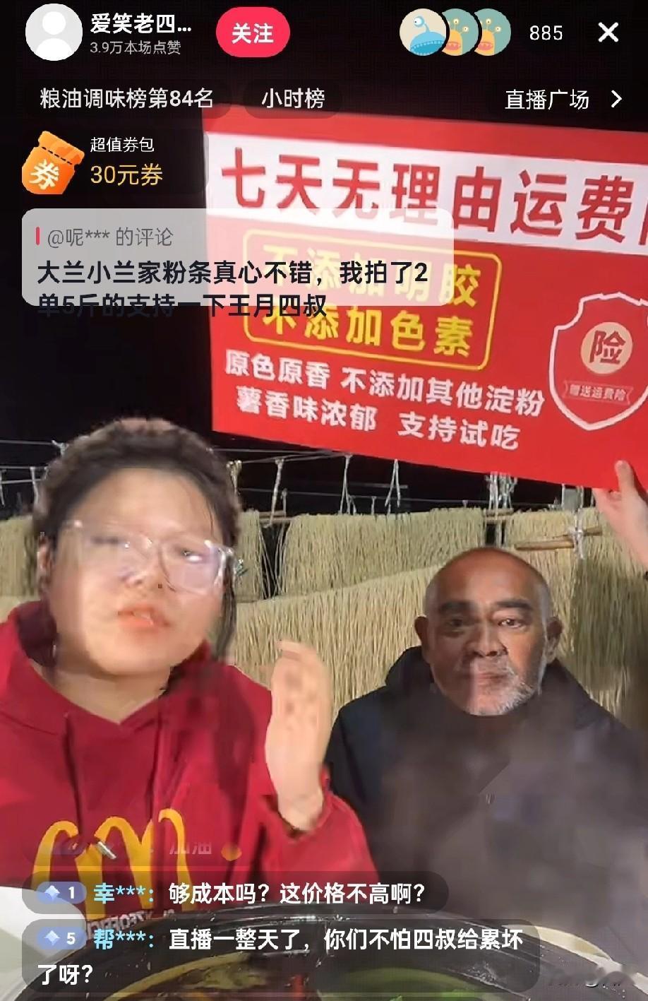太让人心痛了 爱笑老四叔在镜头前,表情木讷,一言不发。为了带货也是拼了,唯一的女儿没有收入,也只好带货。 老四叔家经济压力太大了,两口子都是脑梗,唯一的女儿还没工作。老四叔家除了拍视频带货,也没有其他能挣到钱的门路了。好在有老四叔的侄子小蛋,带着老四叔女儿带货。 在带货直播间,老四叔只是坐在镜头前,看他表情,很难让人相信,这是那个脸上总是挂着笑容,开着货车给别人搬东西的老四叔。 直播间卖的是红薯粉条,价格亲民。小蛋和老四叔女儿在卖力的卖货,老四叔只是呆呆地看着镜头。 直播间人气挺好,有几千人。就是不知道一场直播下来,能够老四叔两口子吃药的钱不。 老四叔家真是应了那句话,有啥都别有病。再也看不到那个风趣幽默,又能吃苦的老四叔了。对此,你怎么看?