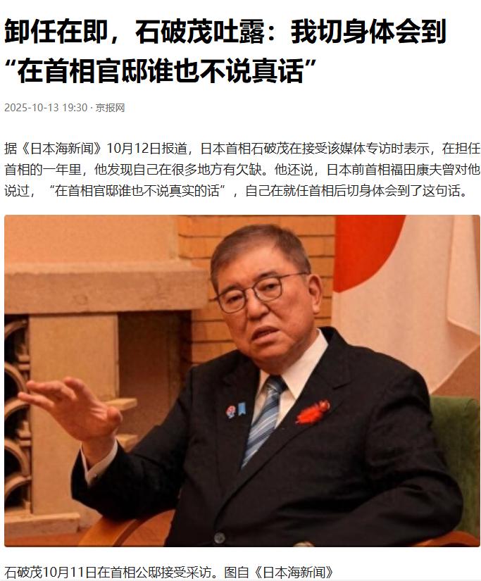 石破茂这老头真是“人间清醒”。近日,记者问他,想不想再当一次首相?没想到,石破茂听后嘴巴大张,愣了半天才确信自己没有听错。随后,他缓和了下激动的情绪,认真回答了记者的问题。 石破茂的政治生涯不算一帆风顺,却始终在日本政坛占据重要位置。1957年出生的他,29岁就子承父业当选众议员,踏入政坛近四十年,从早期的农林水产政务次官,到2002年首次进入内阁担任防卫厅长官,之后又多次出任防卫大臣,在自卫队改革和日美同盟深化等领域留下了自己的印记。 他最让人印象深刻的,是五次角逐自民党总裁的经历——2008年首次参选排名垫底,2012年首轮领先却最终败给安倍晋三,后续又在2018年、2020年两次参选失利,直到2024年9月的自民党总裁选举中,才在九人“大乱斗”中胜出,随后当选日本第102任首相。 然而他的首相任期充满挑战。2024年10月就任后仅8天,石破茂就宣布解散众议院,创下二战后最快解散众议院的纪录。 同年10月的众议院选举中,他领导的自民党与公明党执政联盟大幅失票,没能保住半数席位; 2025年7月的参议院选举,执政联盟再次失利,在参议院也沦为少数派。 党内随之出现大量要求他辞职的呼声,不仅有麻生太郎、高市早苗等资深大佬表达不满,部分年轻议员还发起了“罢免石破茂”的签名运动,甚至有地方支部联合会直接提交了辞职请求。 尽管他曾多次重申留任意愿,否认辞职传闻,但最终还是在2025年9月7日宣布辞去自民党总裁和首相职务,10月21日,石破内阁集体辞职,他的首相任期画上句号。 正是在这样的背景下,10月12日的专访中,“是否再次参选首相”的问题才显得格外尖锐。 面对这个问题,石破茂没有回避,也没有迎合,而是坦诚表示,只要自己还是国会议员,要是国家和形势需要,绝对不会说“做不到”,但这并不意味着他有意主动寻求再次担任首相。 他还补充提到,担任首相的一年里,自己发现了很多自身的欠缺,比如在撰写“战后80年见解”时,多次为不了解的历史事实感到惊讶,而作为首相,根本没有足够的时间和精力去图书馆查阅资料,因为那样会被人说“没事做”,他希望之后能有机会继续提升自己。 这番回应很快引发了连锁反应。部分日本媒体将其解读为“有意回归政坛核心”,认为他没有完全关闭再次竞选首相的大门,是在为未来铺路。 为了避免不必要的误会,石破茂方面及时进行了澄清,明确表示自己的表态只是基于议员的职责,并非主动争取首相职位。 这种媒体与当事人之间的解读差异,在日本政界引发了小小的波澜,不少政治观察家都在讨论这番话背后的深意。 其实石破茂的谨慎回应,离不开他担任首相期间的真切体会。他曾在另一次采访中提到,前首相福田康夫早就对他说过“在首相官邸谁也不说真实的话”,当时他还没有太深的感受,直到自己坐上首相宝座,才真正体会到这句话的重量。 他坦言,首相比普通内阁大臣难当上十倍甚至二十倍,内阁大臣遇到难题还能问“首相我们怎么办”,但首相遇到问题却没人可以商量,身边人大多顾及他的想法,很少有人敢说真话,这种孤立无援的感觉让他印象深刻。 石破茂的经历和回应,也折射出日本当下领导选拔的疲态。 近年来,日本首相更迭频繁,很多人都把这个职位当成了“烫手山芋”。一方面,国内经济复苏乏力,基础生活物价上涨、燃料费用上升等民生问题突出,很难在短期内看到成效; 另一方面,党内派系斗争激烈,执政联盟席位不稳定,稍有不慎就会面临辞职压力,想要长期稳定执政难度极大。 石破茂的遭遇就是典型——尽管他努力推进政治改革,试图解决“政治与金钱”问题,还寻求与在野党合作,但最终还是没能顶住选举失利和党内压力,不得不中途辞职。 如今的石破茂,虽然卸任了首相职务,但作为资深议员,依然在日本政坛发挥着影响力。 他在专访中提到的“继续提升自己”,或许也是对当前政治环境的一种应对。 而他那句“需要则不拒,无意则不求”的回应,既体现了他四十年来的政治智慧,也道出了不少日本政客对首相职位的复杂心态——既明白责任重大,又深知其中的艰难。 这场看似简单的问答,没有惊天动地的表态,却让人们看到了一位政坛老将的清醒与务实。 至于石破茂未来是否会真的再次角逐首相职位,无人能预知答案,但他的经历和回应,已经为观察日本政治提供了一个真实的切片,让人们看到了光鲜政治背后的无奈与挑战。