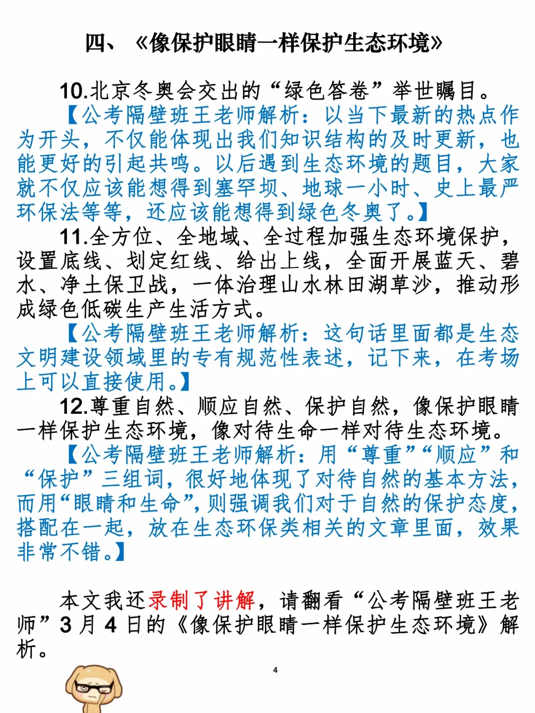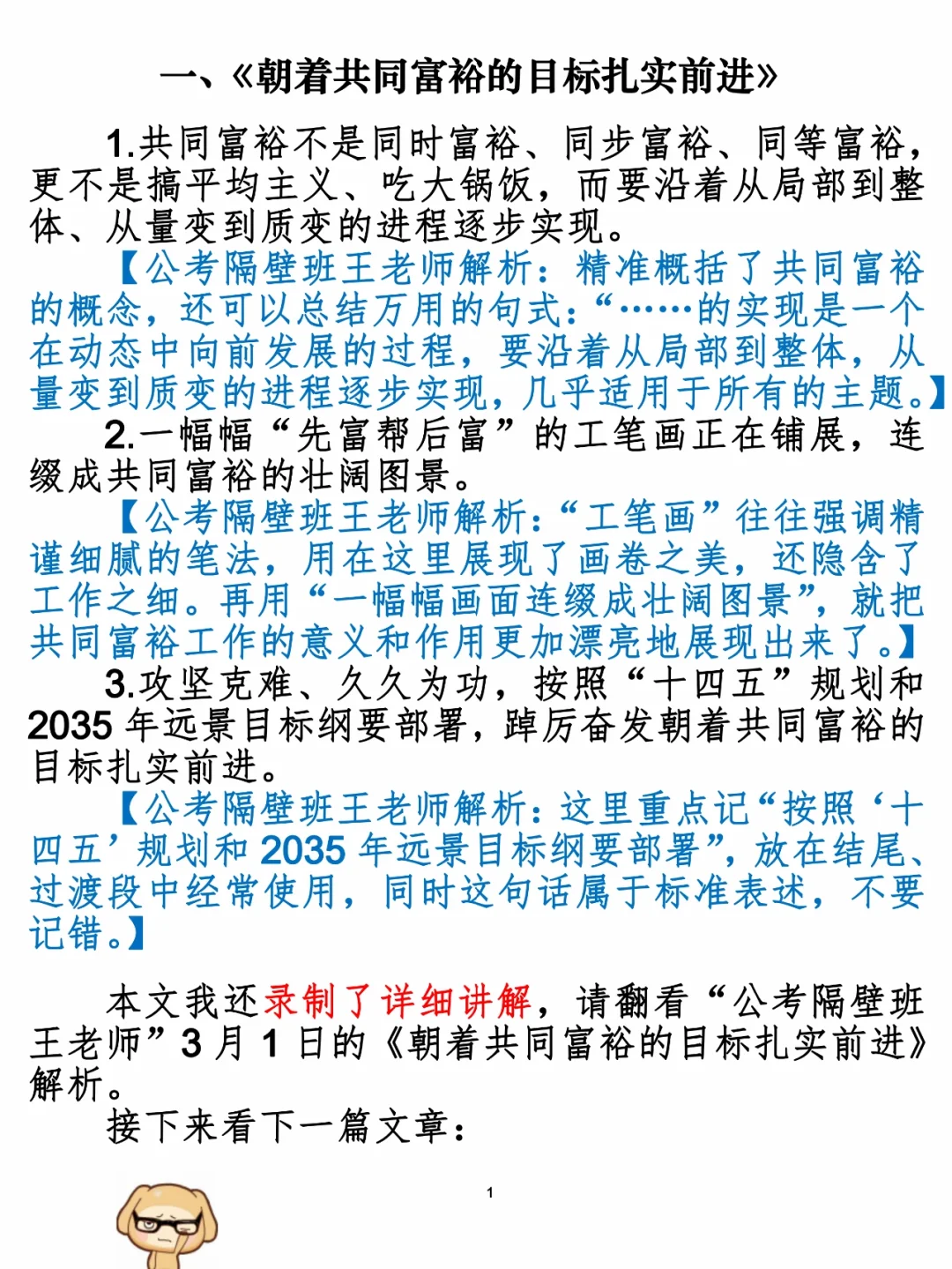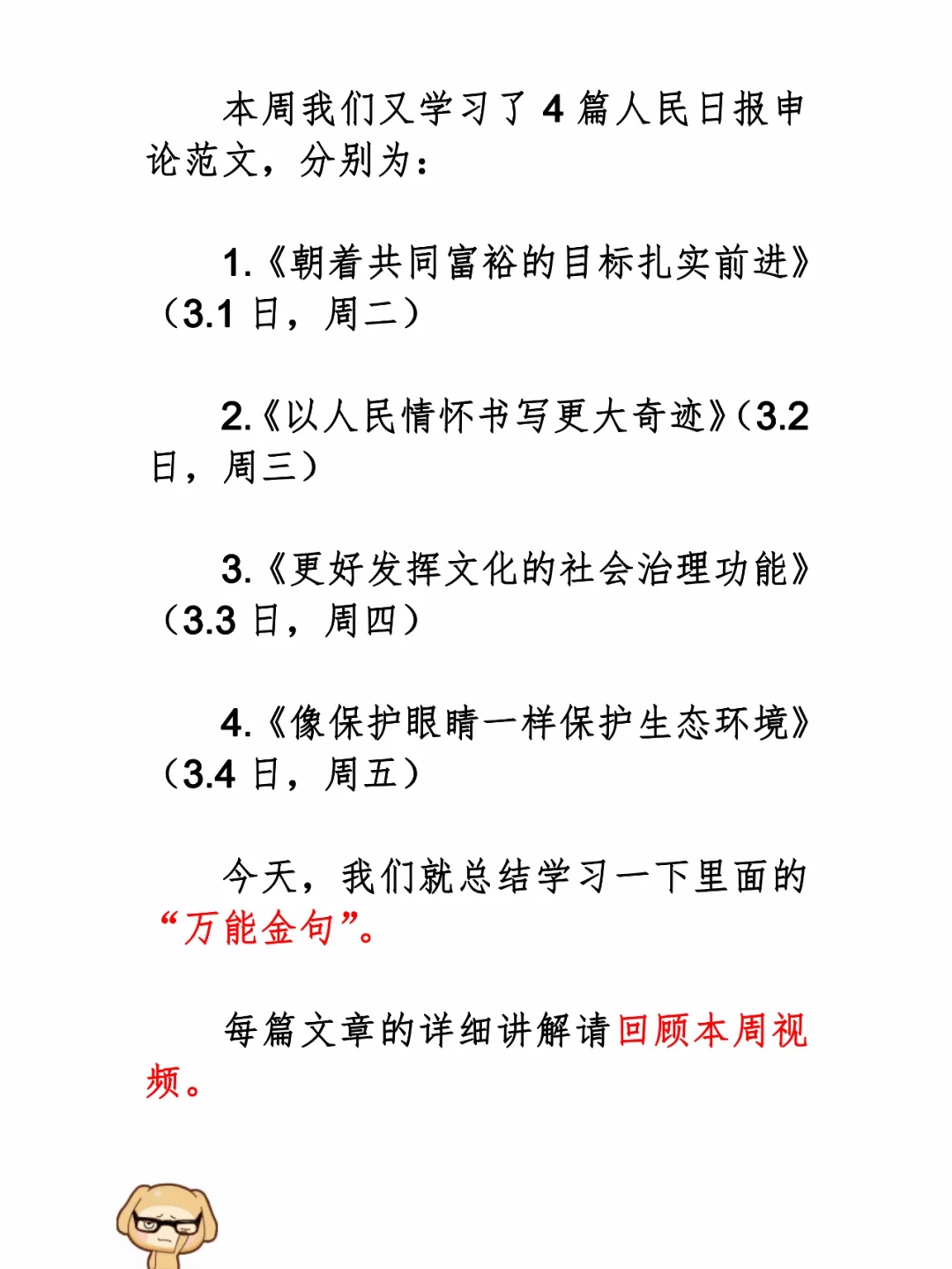 今天我们积累申论素材、必背金句和重点知识。它们来自于一周以来,我们学习的五篇人民日报申论范文,分别是: 1.《朝着共同富裕的目标扎实前进》(3.1日,周二) 2.《以人民情怀书写更大奇迹》(3.2日,周三) 3.《更好发挥文化的社会治理功能》(3.3日,周四) 4.《像保护眼睛一样保护生态环境》(3.4日,周五) 每篇文章的详细讲解请回顾本周视频。 ⭐️ ⭐️ ⭐️ ⭐️ ⭐️ 这里是公老隔壁班王老师独创的“每天半小时 申论80分”抄写团,欢迎加入我们!