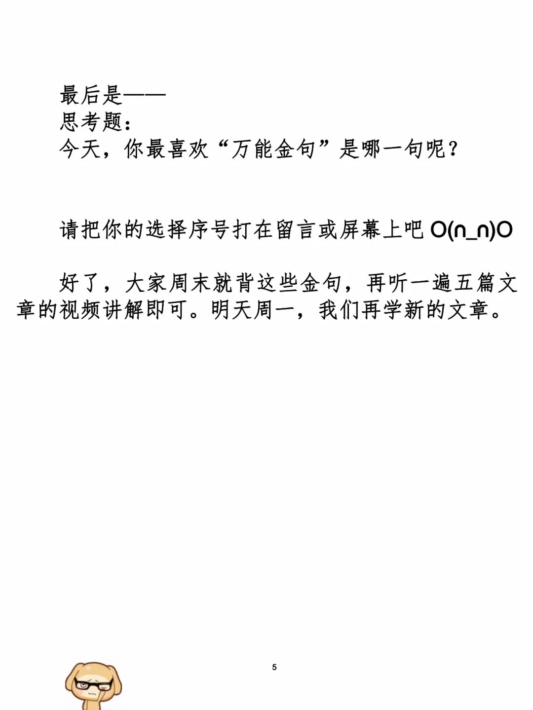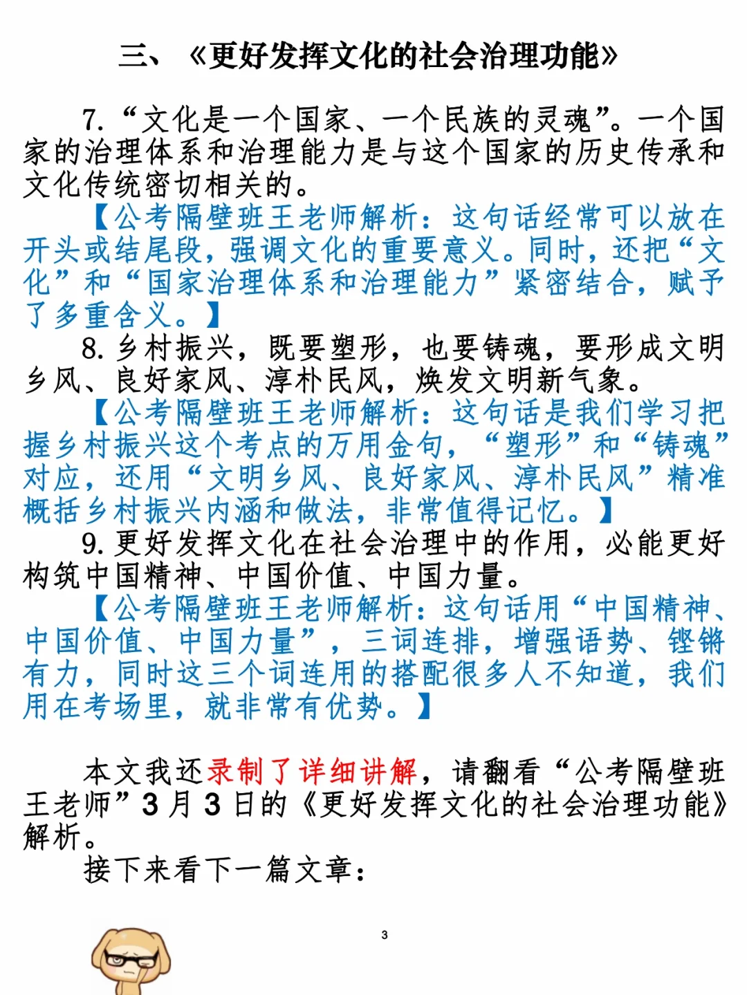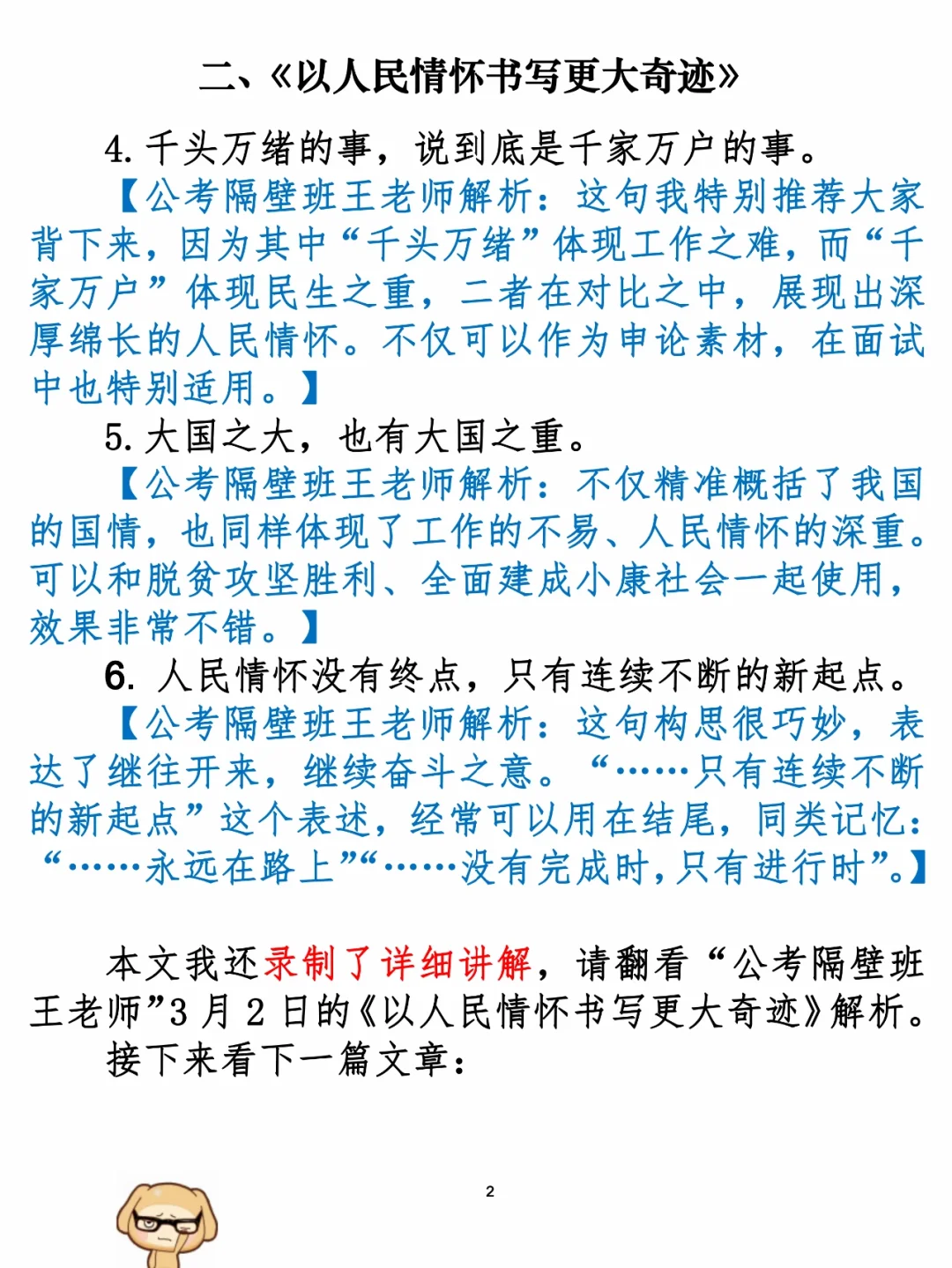 今天我们积累申论素材、必背金句和重点知识。它们来自于一周以来,我们学习的五篇人民日报申论范文,分别是: 1.《朝着共同富裕的目标扎实前进》(3.1日,周二) 2.《以人民情怀书写更大奇迹》(3.2日,周三) 3.《更好发挥文化的社会治理功能》(3.3日,周四) 4.《像保护眼睛一样保护生态环境》(3.4日,周五) 每篇文章的详细讲解请回顾本周视频。 ⭐️ ⭐️ ⭐️ ⭐️ ⭐️ 这里是公老隔壁班王老师独创的“每天半小时 申论80分”抄写团,欢迎加入我们!