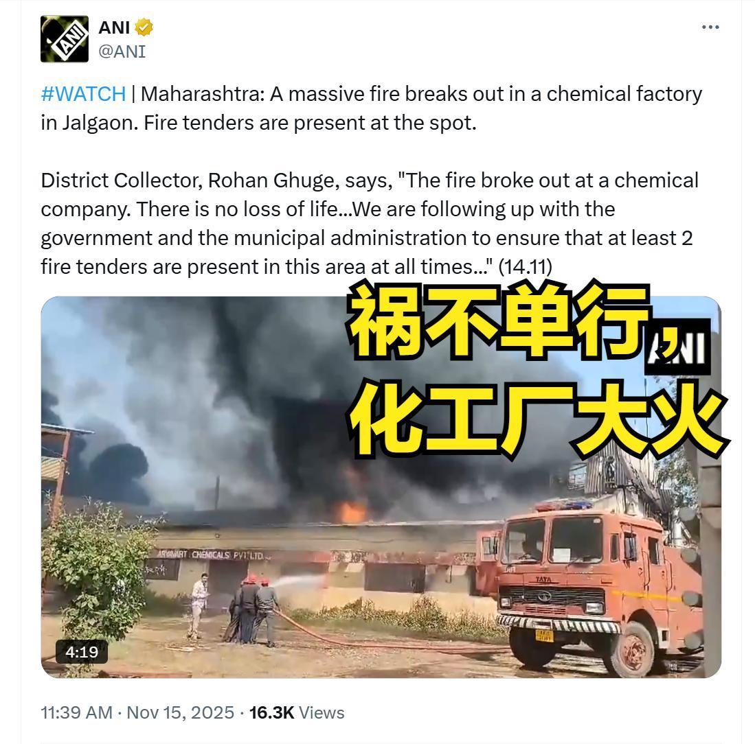祸不单行,印度这几日连续出现炸串+烧鸟事件,而且是多个不同的地方: 一处是印度加尔各答的布拉巴扎区,或许是燃气引起的爆燃,商店街被大火吞噬。20辆消防车进去处理,但碍于街道的过于狭长,几乎就是看着烧完。 另外一处是印控克什米尔地区,法医在搬运收缴的火药时不慎引爆。整栋楼房被夷平。 还有一处则是贾尔冈一家化工厂,媒体说是重大火灾。这么大的火,就一辆消防车在现场喷水。 对了,他们的教练机还在同一天演习中坠毁——印度最近如此密集的事件,总让人预感不对啊。