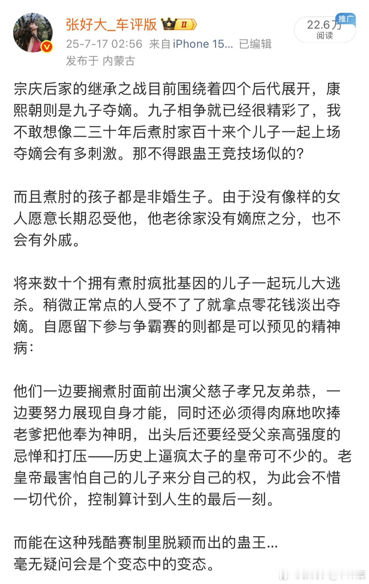 我之前还说徐波(煮肘)家将来要九十龙夺嫡。没想到说少了。二妞妈称徐波总共搞了300个孩子出来。300个…我老家的鸡场下崽儿都没这么大规模。当无爱、偏执和疯狂共同孕育的果实逐渐长大…谁能猜到这最后将是什么人间惨剧…